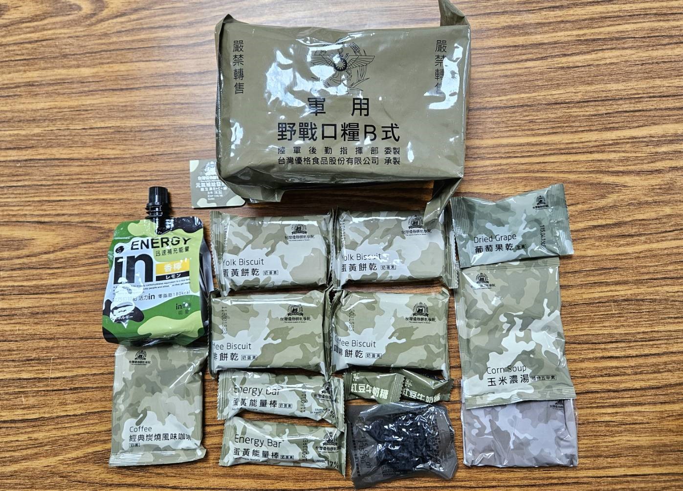 另外,這次演練也使用了「軍用野戰口糧A/B/C式」共600份、加熱式餐盒共300份。這些野戰口糧由陸軍後勤指揮部委託民間業者台灣優格食品股份有限公司承製,3款野戰口糧皆由餅乾、發泡錠、果乾、糖果、能量飲與濕紙巾組成,並另附能量棒、肉乾或紫米紅豆等點心。