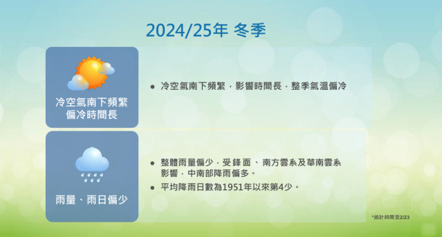 中央氣象署今天(25日)回顧台灣過去3個月的冬季均溫,不僅創下2011年以來最冷的冬天,也是2000年以來第二冷的冬季;降雨方面則只有平均氣候值的7成,降雨日數也寫下1951年以來第4少的紀錄。