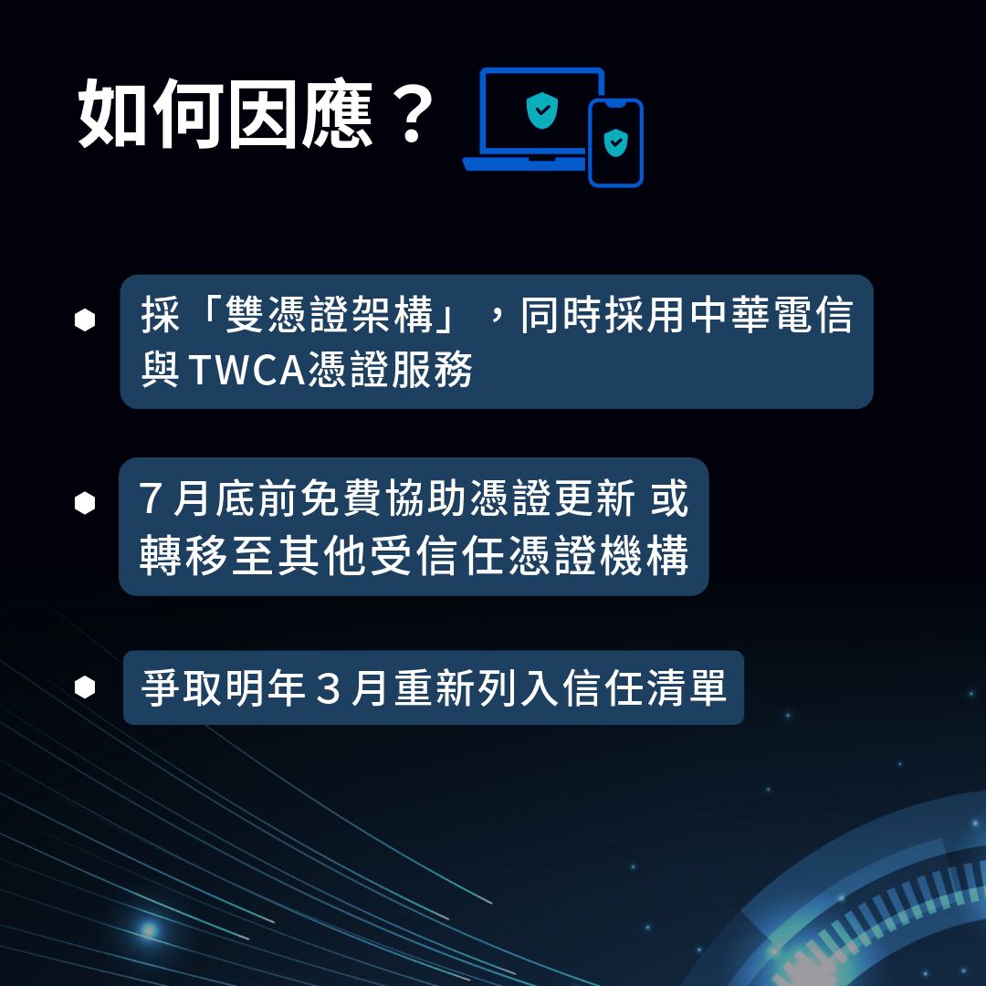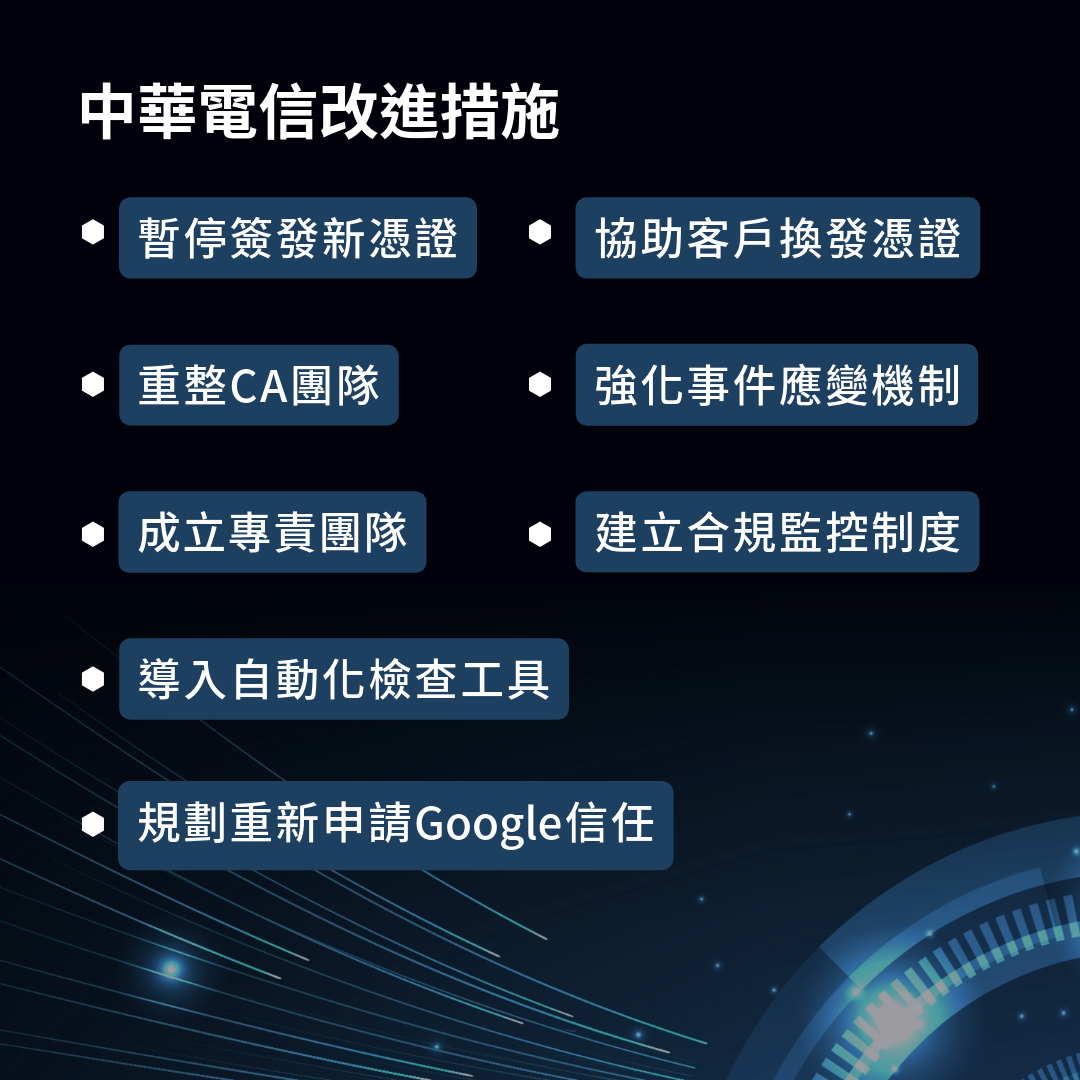 中華電信總經理林榮賜進一步指出,中華電信內部也列出8個項目執行改進,包括暫停簽發新憑證、協助客戶換發憑證、重整CA團隊、成立專責團隊、強化事件應變機制、建立合規監控制度、導入自動化檢查工具,以及規劃重新申請Google信任。