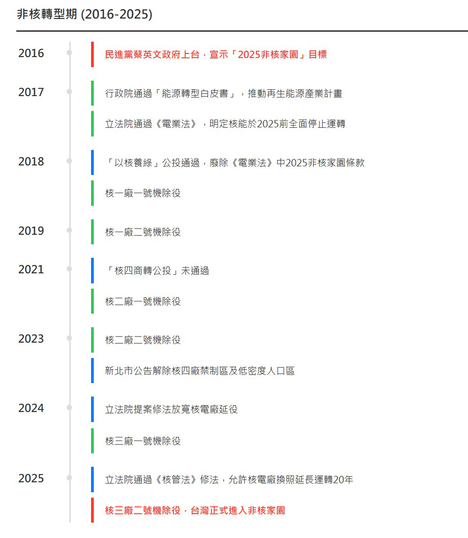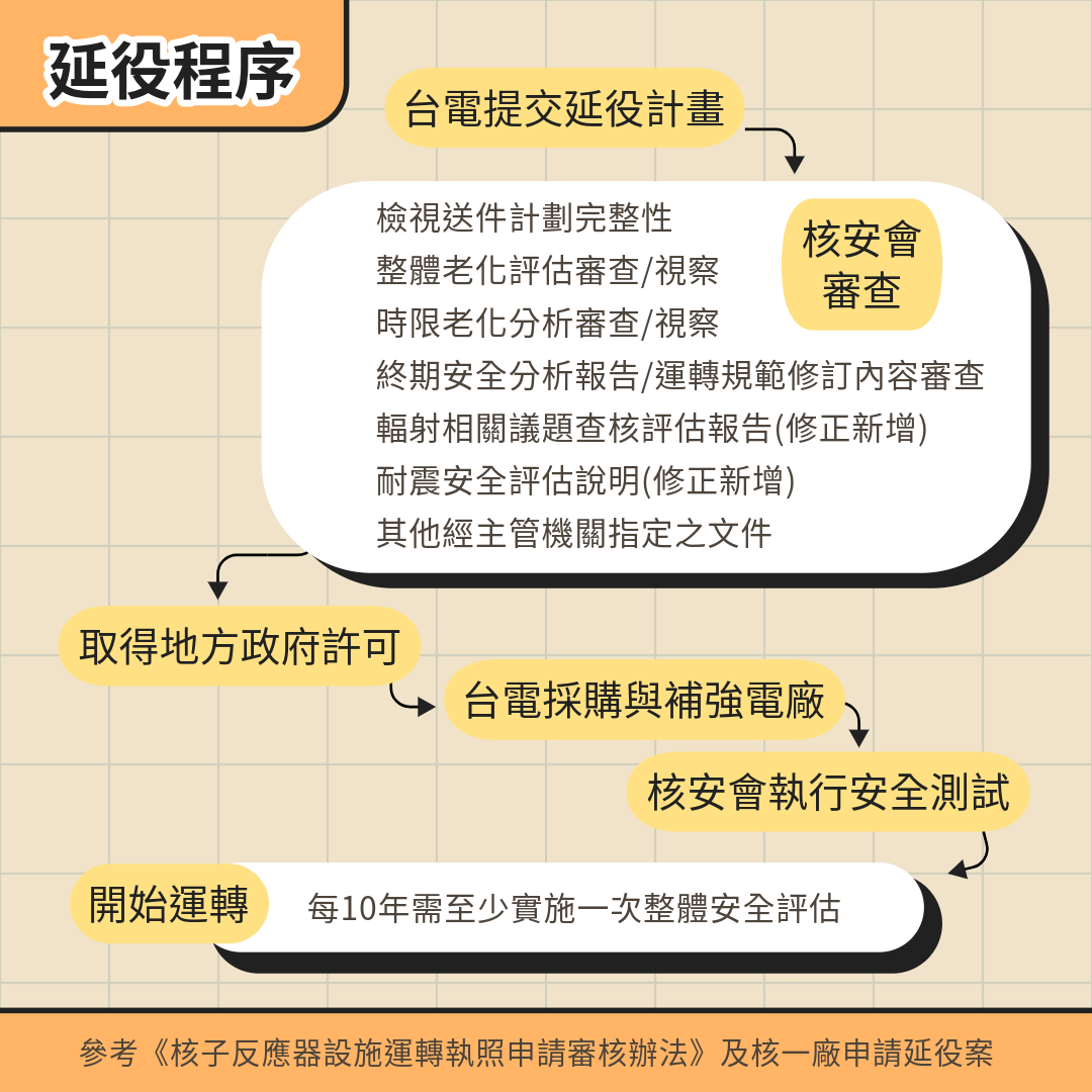 立法院會於今年5月13日三讀修正通過《核子反應器設施管制法》第6條,明定核電機組運轉執照有效期間最長為40年,期滿須繼續運轉者,經營者得於有效期間屆滿前向主管機關申請換發執照。換發之運轉執照,其有效期間自執照生效日起算,最長為20年,為台灣核電廠延役開了綠燈。