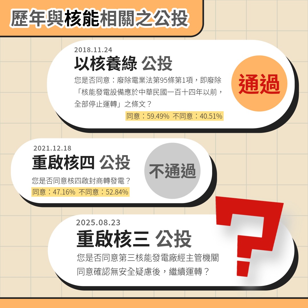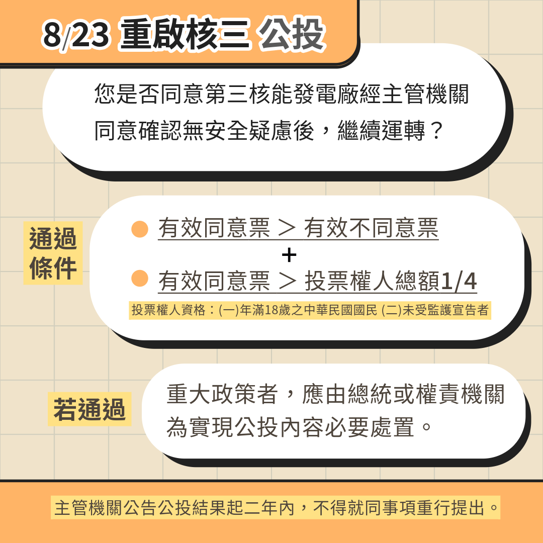「重啟核三」公投將於8月23日登場,主文是「您是否同意第三核能發電廠經主管機關同意確認無安全疑慮後,繼續運轉?」
