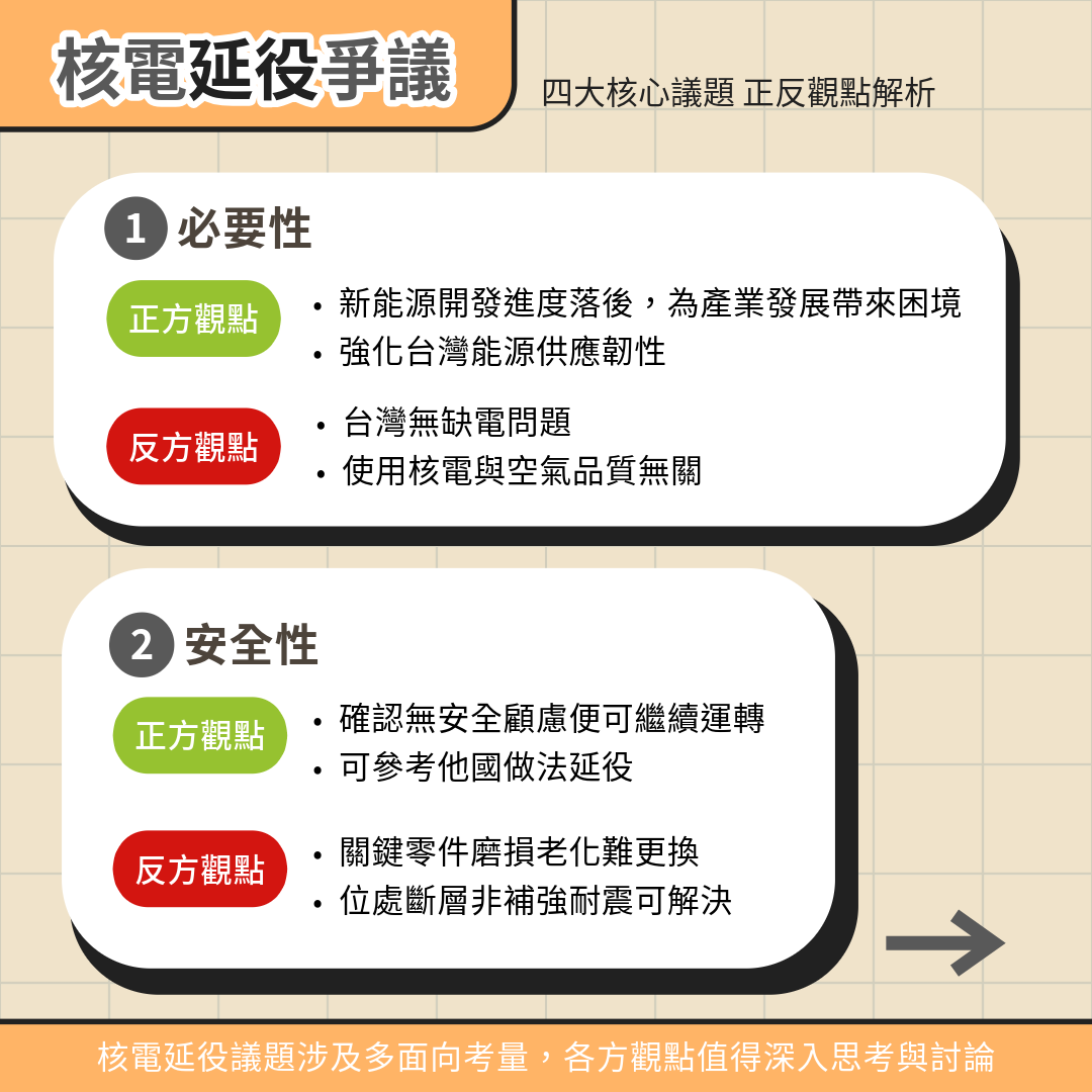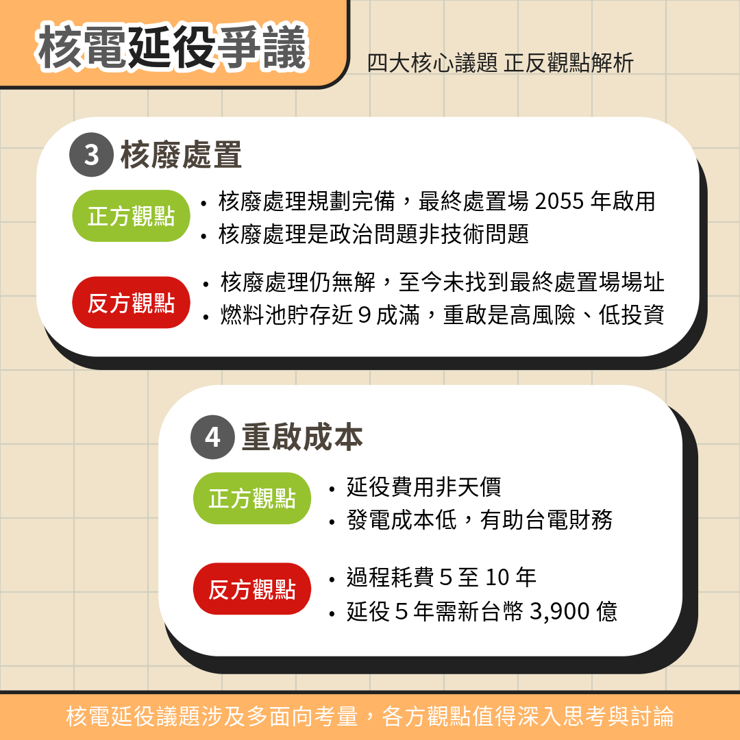 核電爭議在台灣已長達30多年,這也是繼2018年11月的「以核養綠」公投、2021年12月的「重啟核四」公投後,第三度針對核能相關議題進行全國性公民投票。而對於核三是否重啟,爭議點主要在於必要性、安全性、核廢處置及重啟成本4個面向。