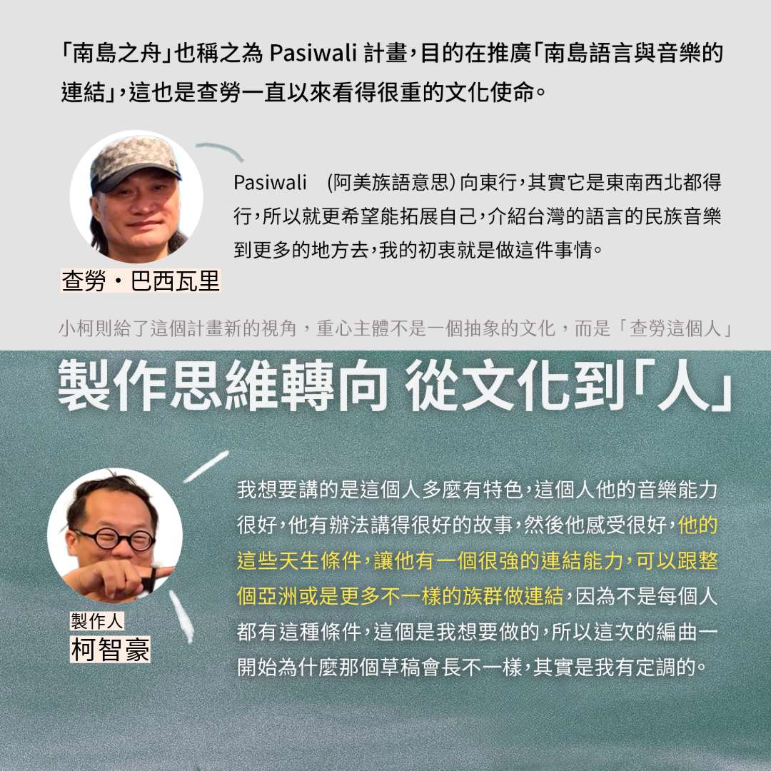 「南島之舟」也稱之為Pasiwali計畫,目的在推廣「南島語言與音樂的連結」,這也是查勞一直以來看得很重的文化使命。查勞:『(原音)這個計畫,Pasiwali的計畫,(阿美族語意思)向東行,其實它已經不是只有向東行,它是東南西北都得行,對,所以就更希望就是能夠拓展自己,就是台灣的語言的一個音樂,就是民族音樂可以介紹到,更多的地方去,這個就是一開始,我的初衷就是做這件事情,因為其實很辛苦的一件⋯做音樂的一個任務,對我來說,因為不會賺錢啦,只會花錢,但是我們更希望就是可以更多的機會去傳達台灣的音樂,新的音樂態度,跟我們現在台灣的音樂,流行的音樂是在哪裡,但主要我們在做南島音樂跟語言文化的一個連結的一個唱片計畫。』