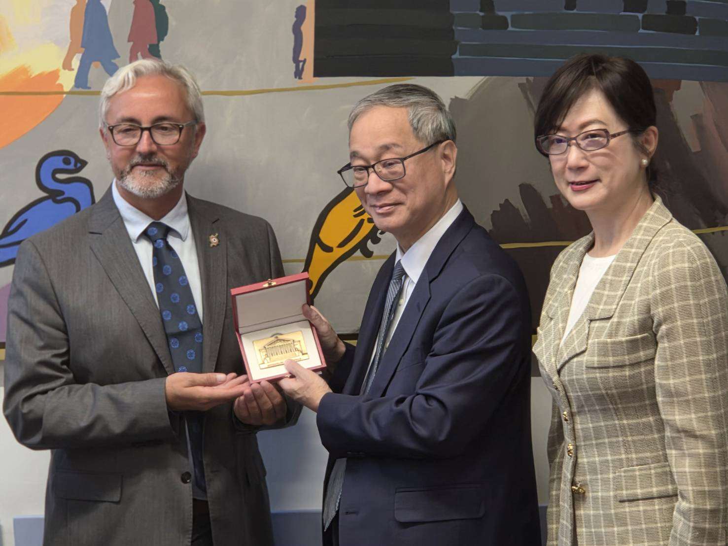 文化部長李遠(中)與法國國民議會友台小組副主席馬蒂諾(左)交換禮物,右為台灣駐法國大使郝培芝。(江昭倫 攝)