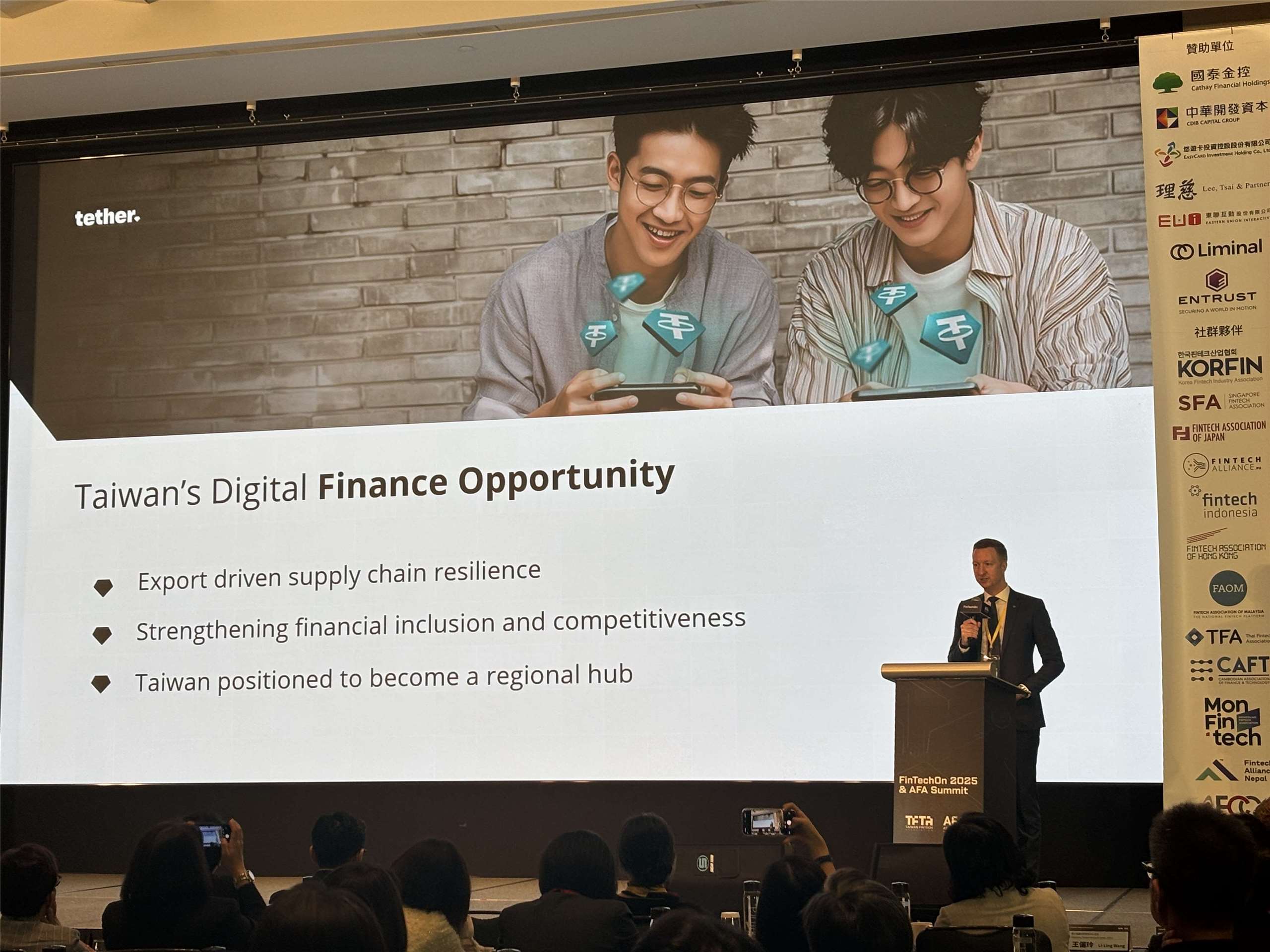 泰達幣副總裁Giles Dixon說,穩定幣對全球、包括台灣都是成長的催化劑,穩定幣監管不僅僅是關於控制,更是關於建立信任、釋放參與,並使台灣成為數位金融創新的領導者,「沒有它們,機會只存在理論階段;但有了它們,它就成為台灣的競爭優勢」,他認為台灣可以後發先至。他說:『(英文原音)正如我所說,台灣制定自己的穩定幣監管是一個很好的機會。我認為台灣處於一個絕佳的位置,因為我們已經看到了歐洲、日本等地的先行者提出了他們監管這個行業的嘗試,這是一件好事,因為在這種情況下,作為第二波參與者,你可以觀察世界上其他地方做得好的地方和可能做得不好的地方,然後提出一些對本地行業非常有吸引力的東西。』