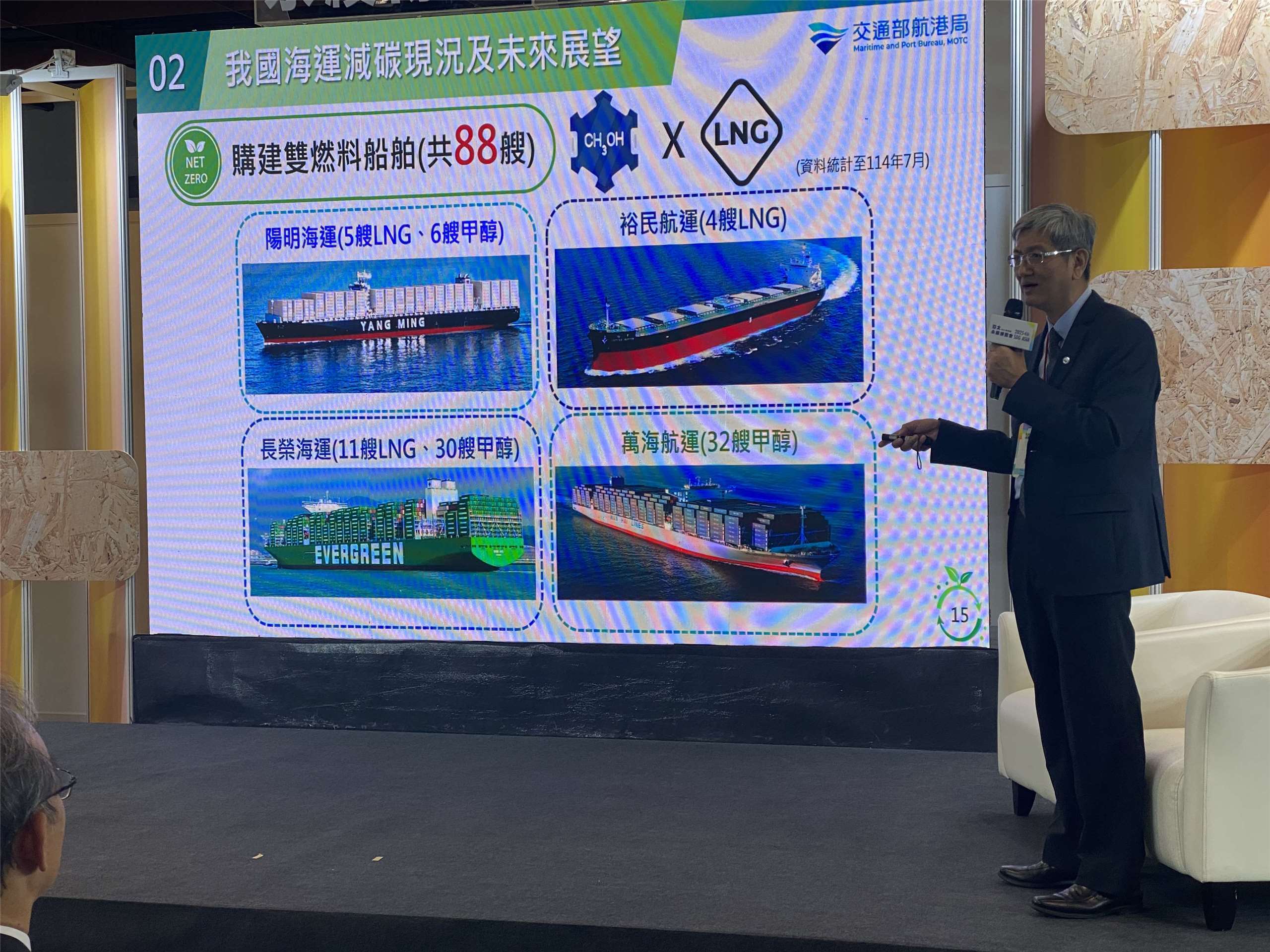 在這場論壇上,航港局長葉協隆也以「海運減碳推動策略與未來路徑」為題進行專題報告。葉協隆指出,目前海運業者除了要面對IMO即將於今年10月決議自2028年起實施「溫室氣體減排中期措施」,建立海運溫室氣體定價,還要因應今年開始上路的「歐盟海事燃料法案」,針對排放超標的船舶收取碳費或罰款。因此,目前國際海運使用LNG或甲醇的新能源船占比已達6成4,日本首批氨燃料船也預計明年下水。