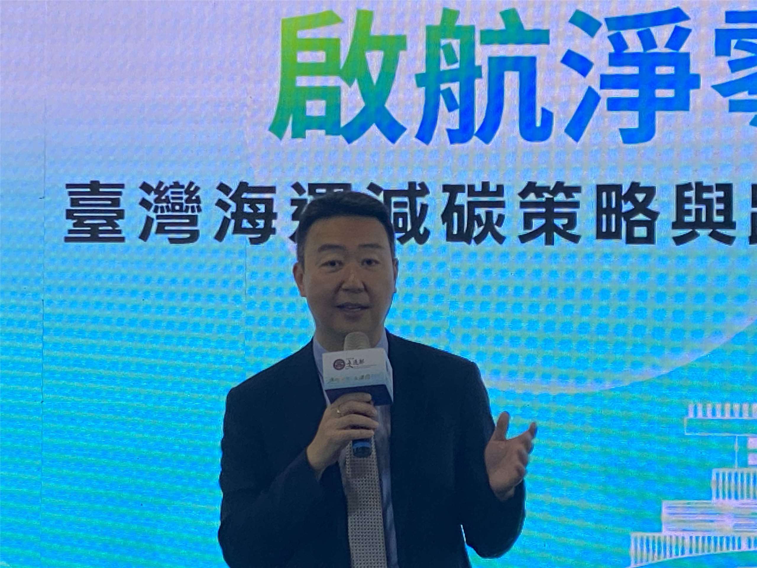 航港局長葉協隆11日在「啟航淨零」高峰論壇上,以「海運減碳推動策略與未來路徑」為題進行專題報告。(吳琍君攝)