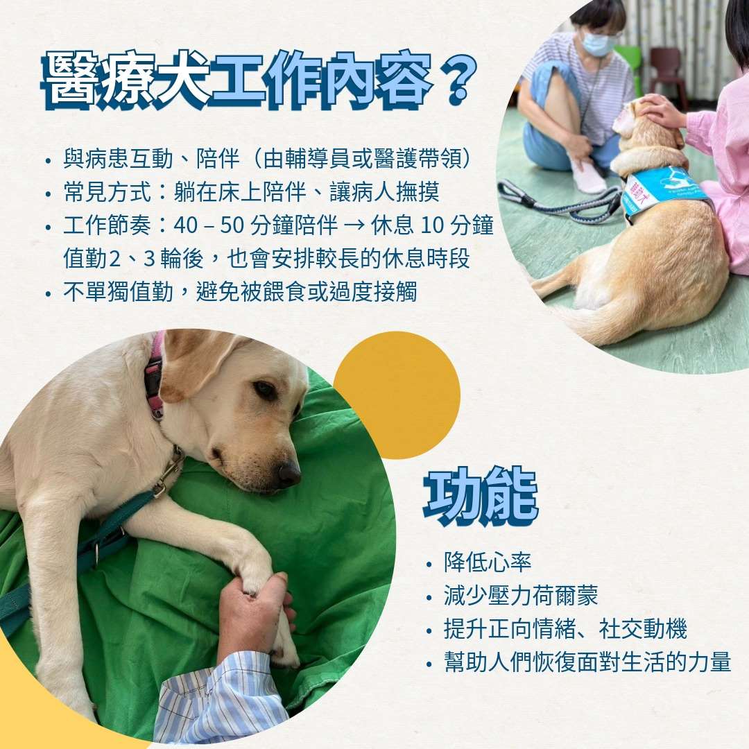 另外15隻醫療輔助犬則是每2週由訓練師或志工家庭帶領,前往北部合作的醫院、安養院、特殊醫療機構等,與病患及家屬互動。