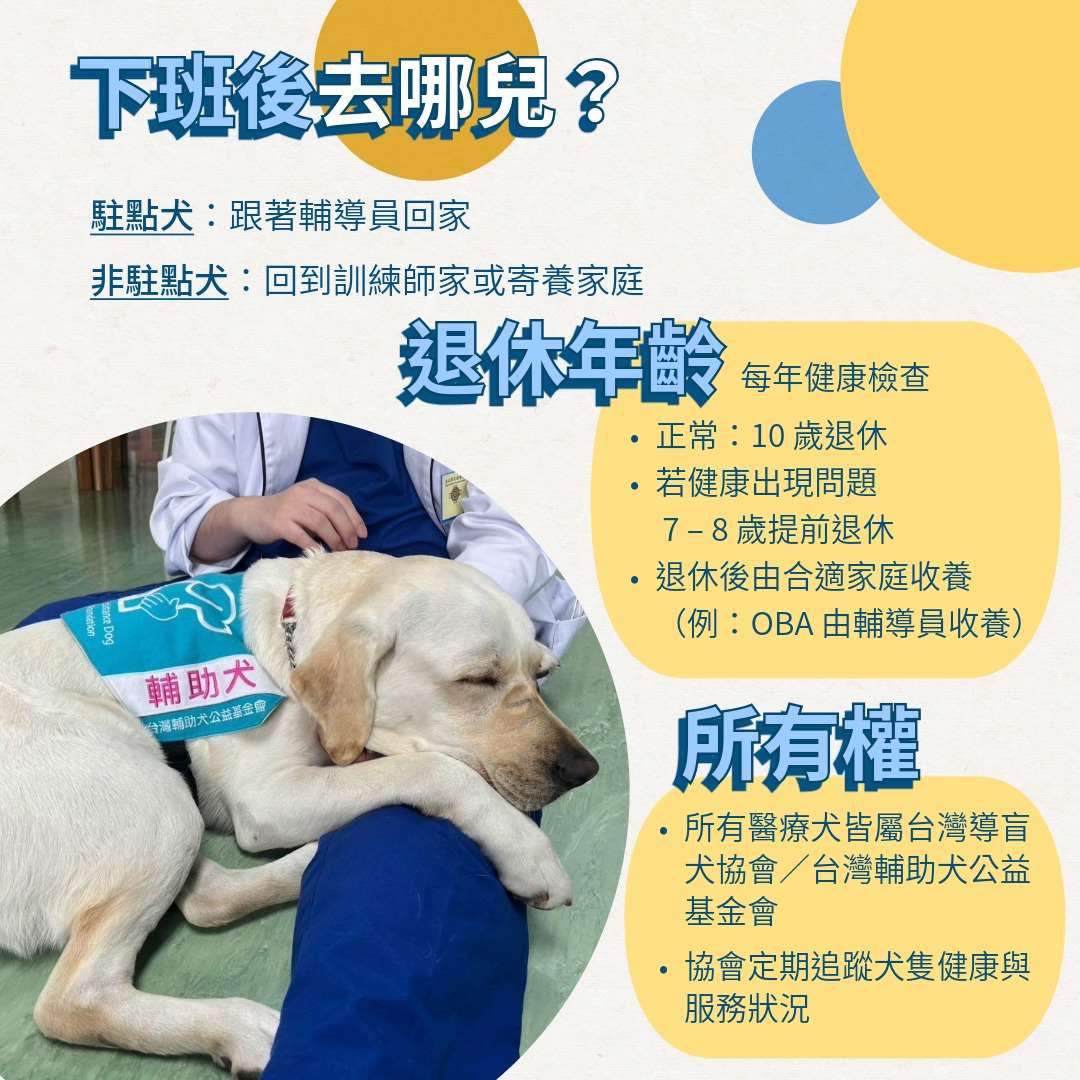 至於未駐點的醫療犬,下班後則是與訓練師一同回家,或是回到寄養家庭住宿。