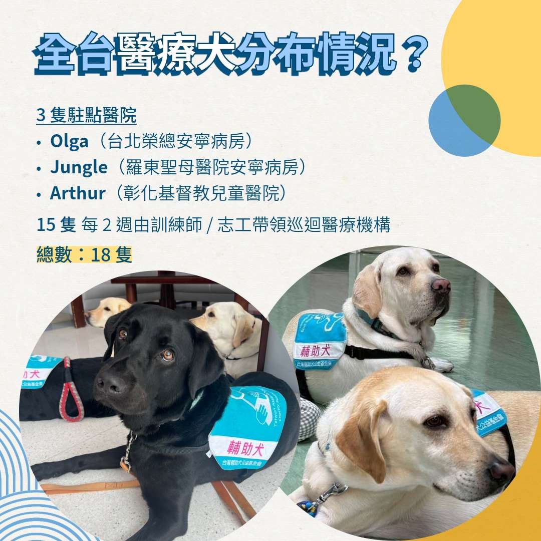 全台現今共有18隻醫療輔助犬,其中3隻固定駐點於醫院,包括接棒OBA(歐巴)進駐台北榮總安寧病房的Olga(歐佳)、駐守宜蘭羅東聖母醫院安寧病房的Jungle(阿福),以及在彰化基督教兒童醫院服務的Arthur(亞瑟)。