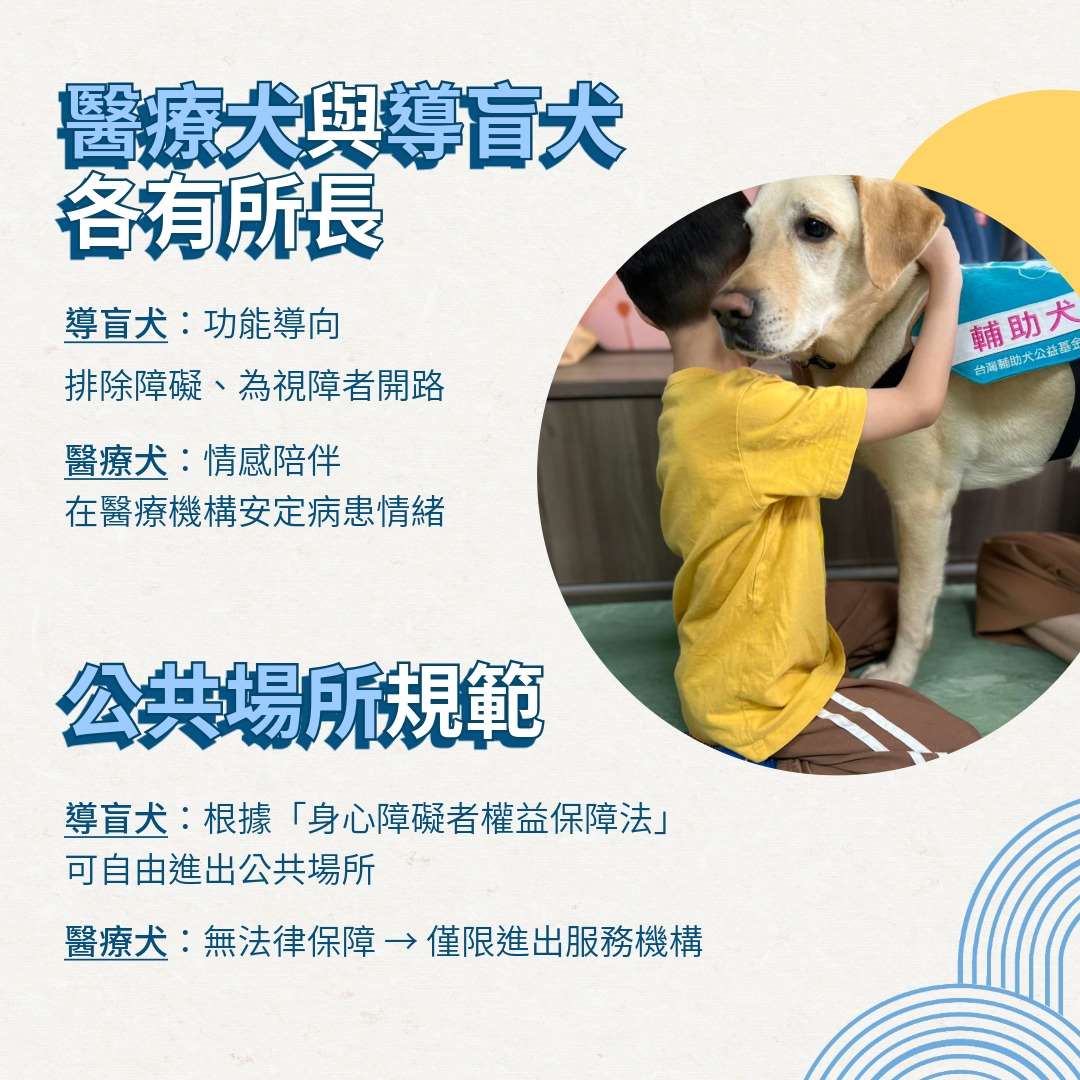 簡單區分,導盲犬的功能導向較強,必須能排除障礙、為視障者開路。醫療犬雖然功能性相對較弱,但仍具備其特長與不可替代性。