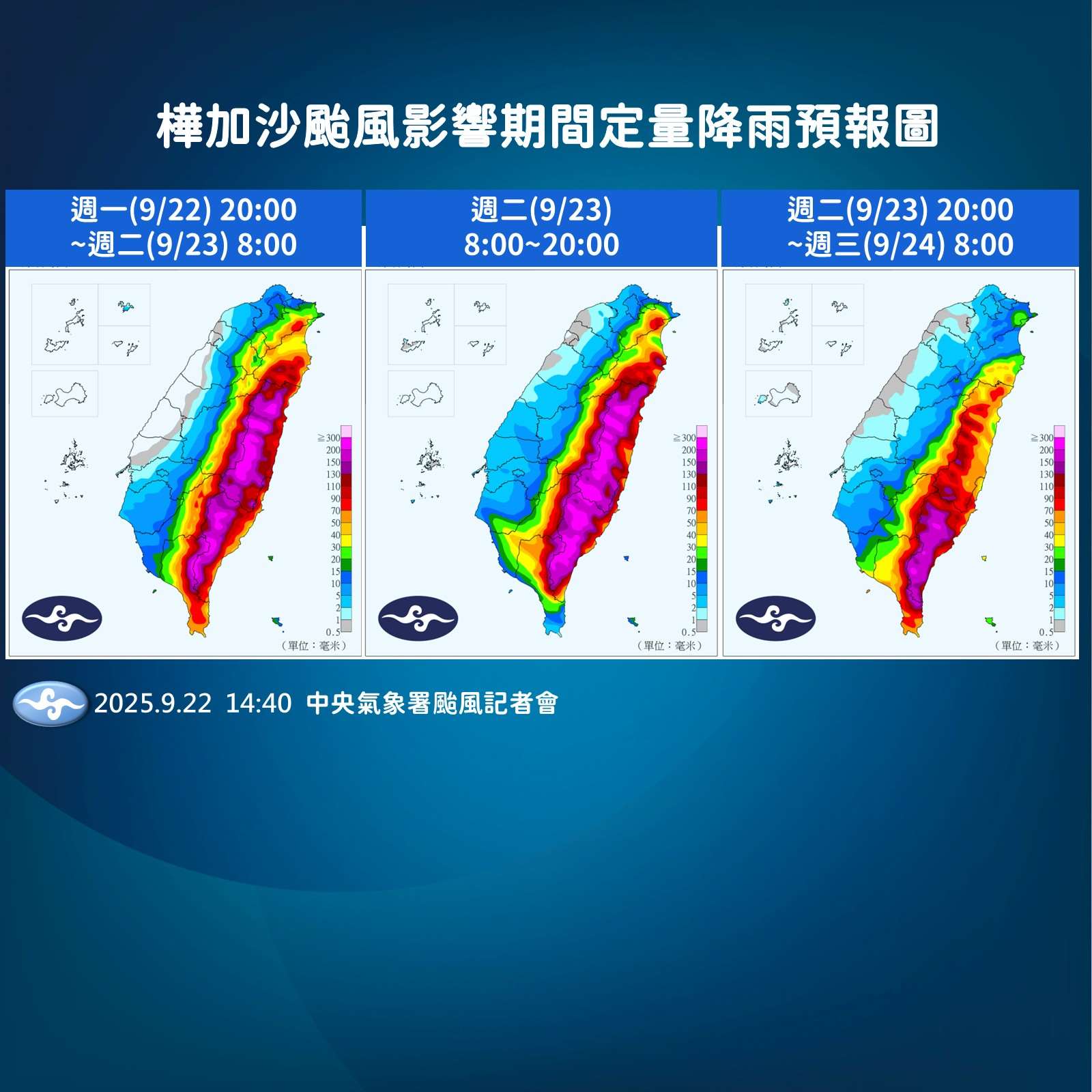 目前氣象署持續針對宜蘭山區、花東地區、綠島、蘭嶼、恆春半島和屏東山區發布豪雨特報,並針對大台北地區、宜蘭平地、屏東平地、桃園山區、台中山區、南投山區和高雄山區發布大雨特報。預估入夜後到23日,整個東半部地區、恆春半島和高屏山區會有大雨或局部豪雨;尤其是宜蘭山區、花東平地和山區,還有高屏山區,將會有大豪雨等級的降雨。氣象預報中心簡任技正伍婉華說:『(原音)從今天下半天、晚上開始一直到明天,將是這次颱風影響整個東半部地區、高屏山區,降雨最顯著的時候。我們就以12小時定量降雨預報可以看到,是粉紫色的,在花東以及高屏山區可能會有200毫米以上的降雨;而現在我們所發布的整個總雨量的預報,最重要就像宜蘭山區、花東的平地、高屏山區,最大雨量會落在400毫米到600毫米之間,那麼花東的山區最大雨量會在500毫米到800毫米之間。』
