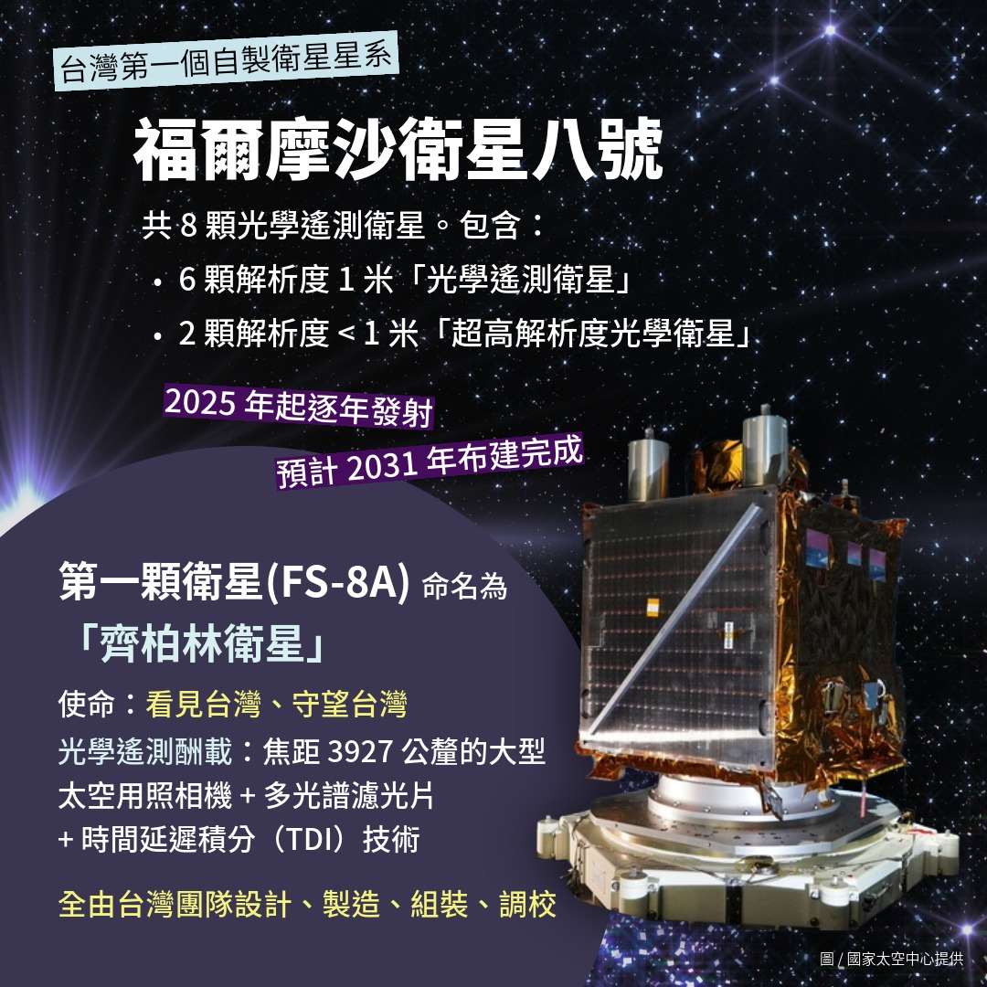 「福衛八號」由國家太空中心(TASA)結合國內產學研界自主研發,包含6顆原始解析度1米的「光學遙測衛星」、以及2顆原始解析度小於1米的「超高解析度光學遙測衛星」。將自今年(2025年)起逐年發射,預計2031年布建完成。