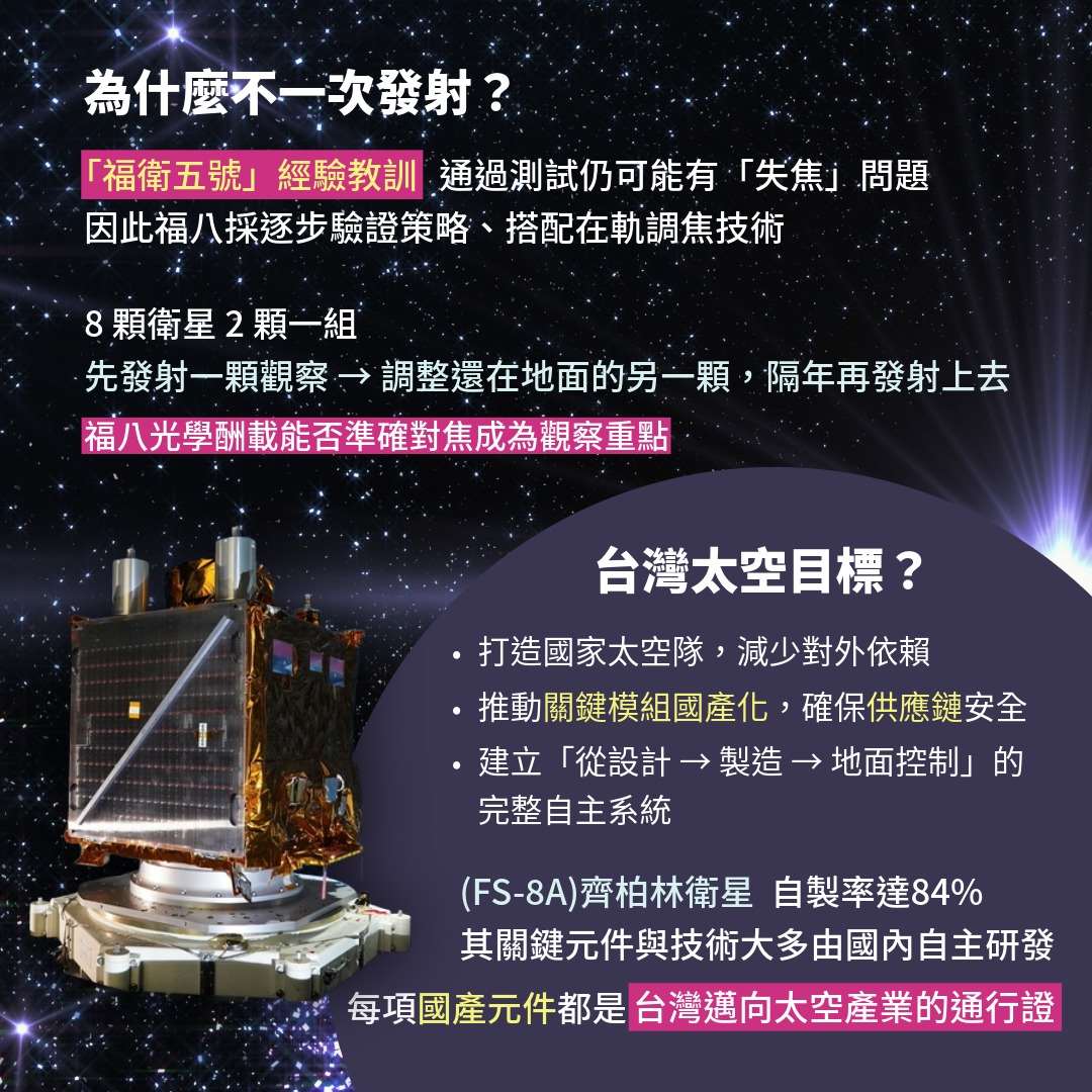 太空中心指出,福八的8顆衛星為2顆一組,1顆上去後,先觀察它的表現,如果需要調整,就能調整還在地面的另一顆衛星,接著隔年再發射上去。