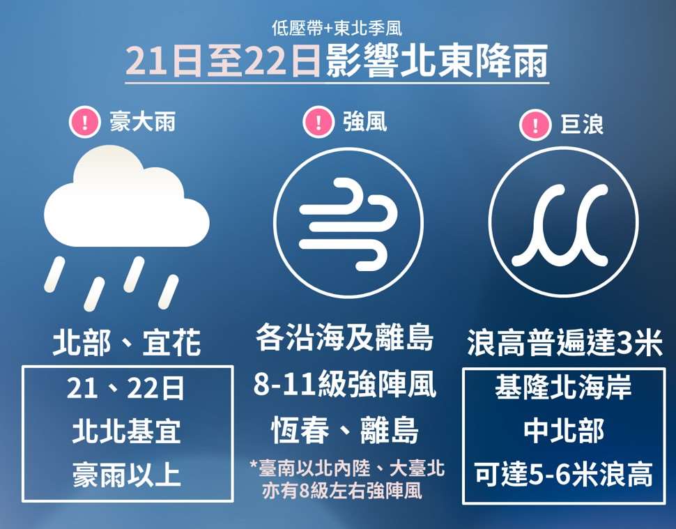 在東北季風與低壓環流幅合下,中央氣象署今天(21日)持續針對大台北山區發布超大豪雨特報,並針對雙北和宜蘭發佈大豪雨特報;此外,還提醒沿海已有3-6米的大浪,部分地區更出現9-11級的強陣風。