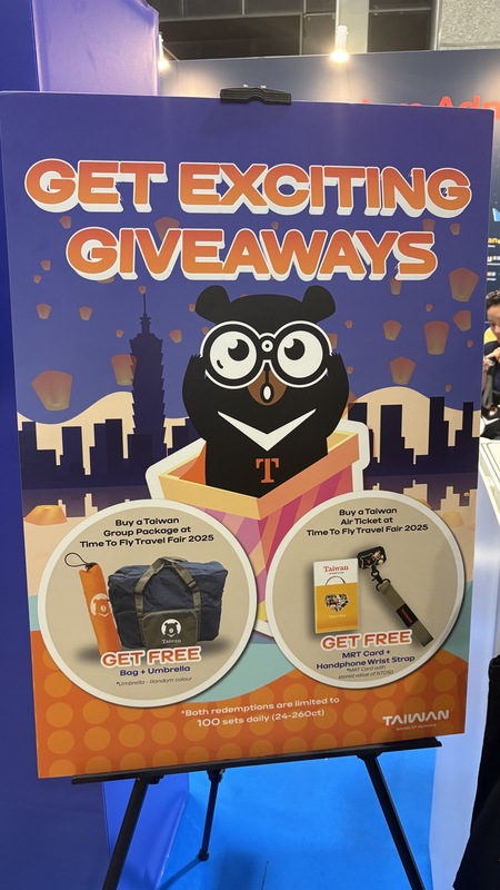 新航旅展24日登場,觀光署推出優惠,購買台灣機票送悠遊卡、加手機腕帶;在旅展買團體行程送喔熊行李袋與喔熊雨傘。(觀光署駐新加坡辦事處提供)(圖:中央社)