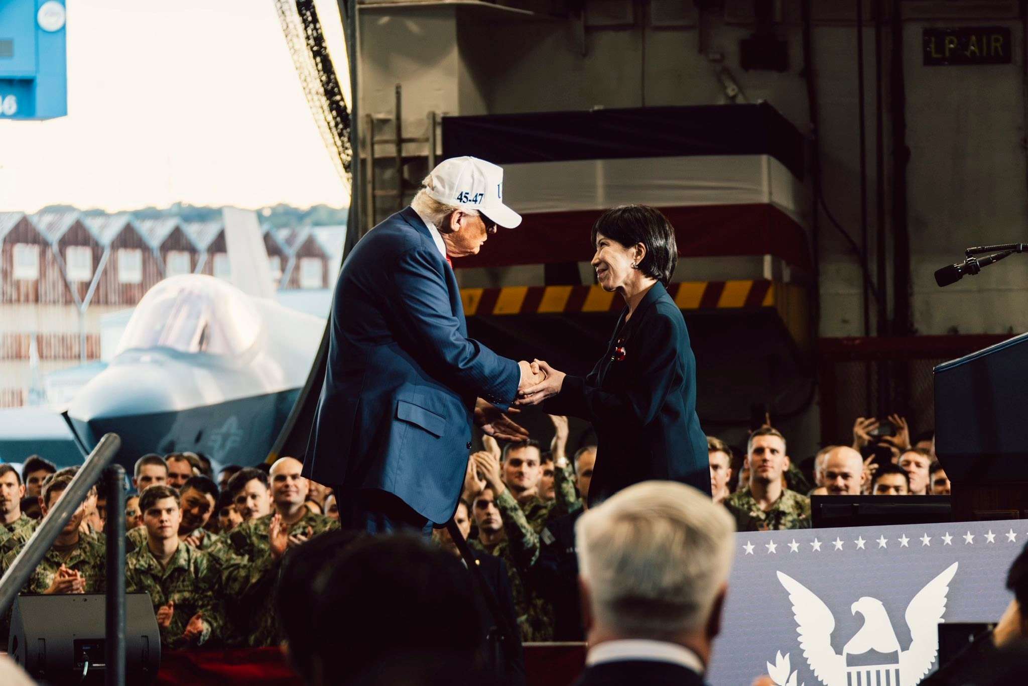 日本首相高市早苗(右)與訪日的美國總統川普10月28日一同登上橫須賀港邊的航空母艦「喬治・華盛頓」號。(翻攝USS George Washington CVN 73臉書)