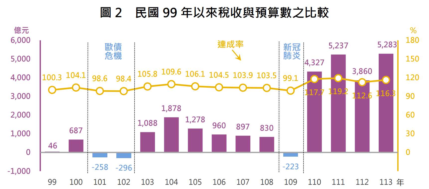 根據財政部統計,2010年至2020年間雖然僅有3年「短徵」,即預算數多於實徵數,但其餘「超徵」年度數額也皆在2,000億元以下;然而,2021年超徵數額急遽攀升至4,327億元,到2024年更創下歷史新高,超徵總額達5,283億元。財政部解釋主要受到上市櫃公司獲利成長,加上股利、薪資及利息所得同步上升影響,導致實徵數遠大於預算數(即超徵)。