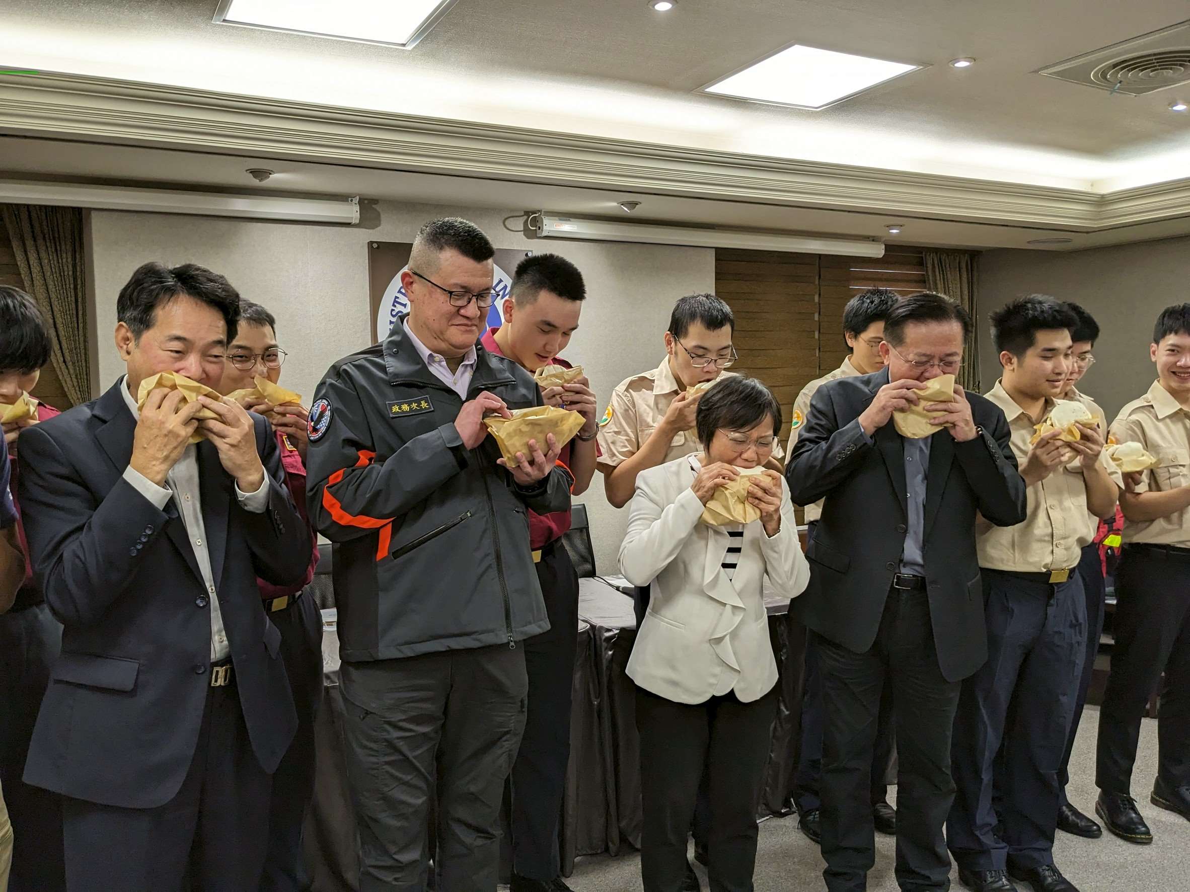 內政部長劉世芳和與會部內公務人員一起大啖刈包,以行動支持本土養豬業。(陳念宜 攝)