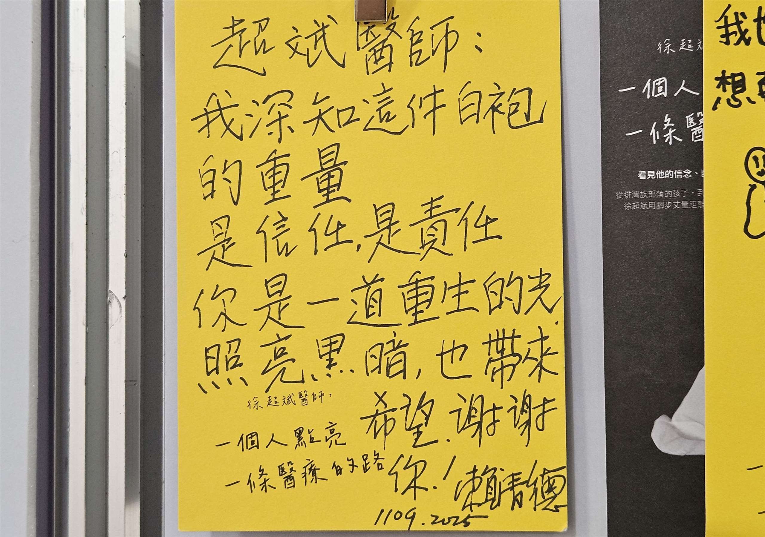 賴清德總統在攝影展上親筆留言,感念徐超斌的貢獻。(劉品希 攝)