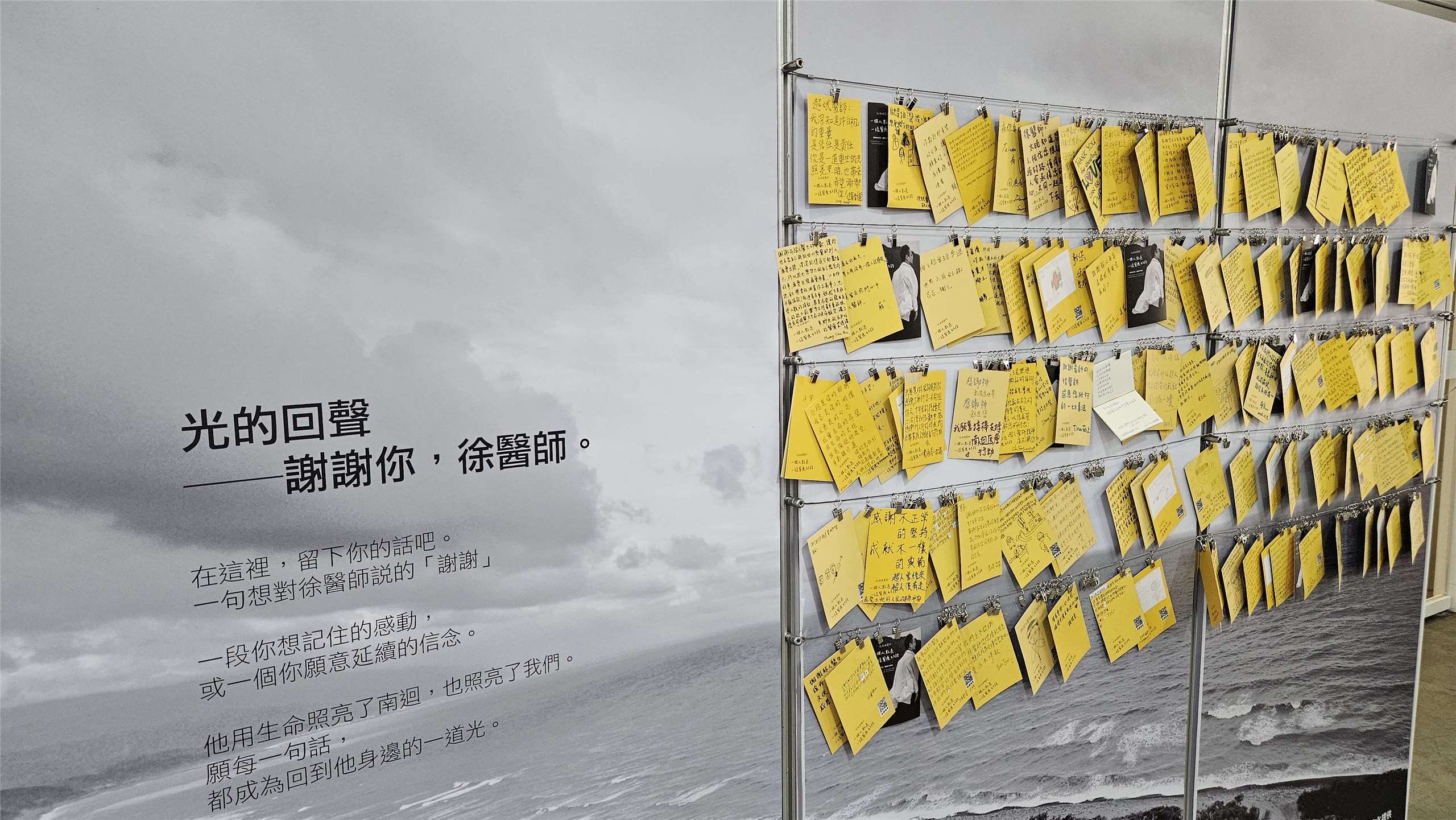 南迴基金會舉辦徐超斌攝影展,追思牆上掛滿各界悼念。(劉品希 攝)