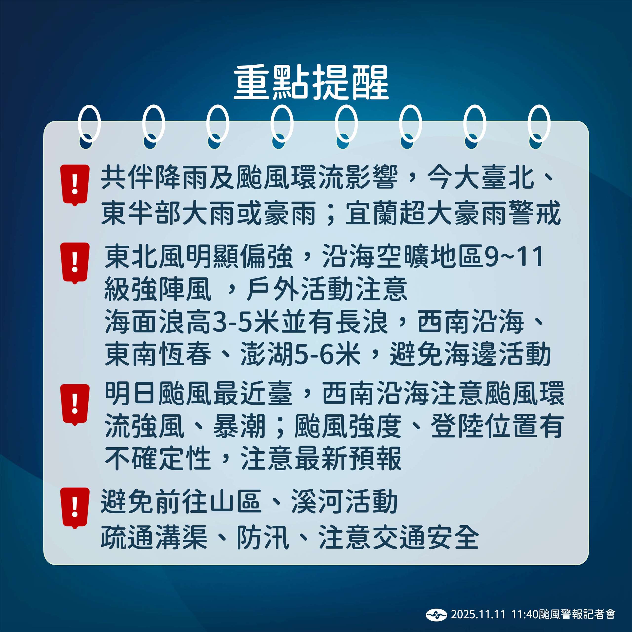 氣象署提醒,從10日迄今,宜蘭西帽山累積雨量已超過600毫米,台東牛頭山也已上看400毫米,新北大粗坑也超過300毫米,花蓮太安則將近300毫米,台北擎天崗也快到270毫米,屏東也超過200毫米。氣象署也持續針對宜蘭山區發布超大豪雨特報,同時針對宜蘭、花蓮和蘭嶼、綠島發布大豪雨特報,另外在基隆北海岸、台北山區、新北、桃園山區、屏東山區、恆春半島以及台東發布豪雨特報;同時提醒台北、台中山區、南投山區和高雄山區會有大雨發生的機率。