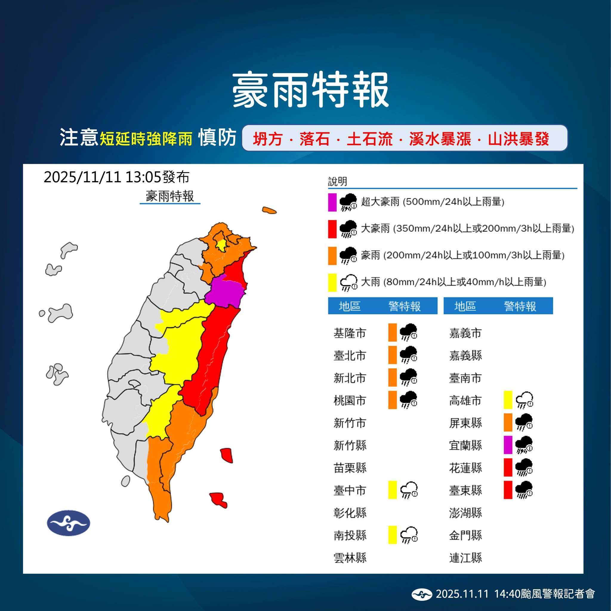 不過受到颱風外圍環流與東北季風產生的共伴效應影響,宜蘭東澳嶺從10日到11日下午2時的累積雨量已超過700毫米,而且單以11日14小時的累積雨量也已達464毫米、達到超大豪雨等級,因此氣象署特別針對宜蘭發布降雨警戒!此外,目前主要的雨勢仍集中在基隆北海岸、大台北山區和東半部地區;所幸11日入夜後,隨著颱風北上,東半部的雨勢也將逐漸趨緩,但中南部的雨勢則將轉趨明顯。