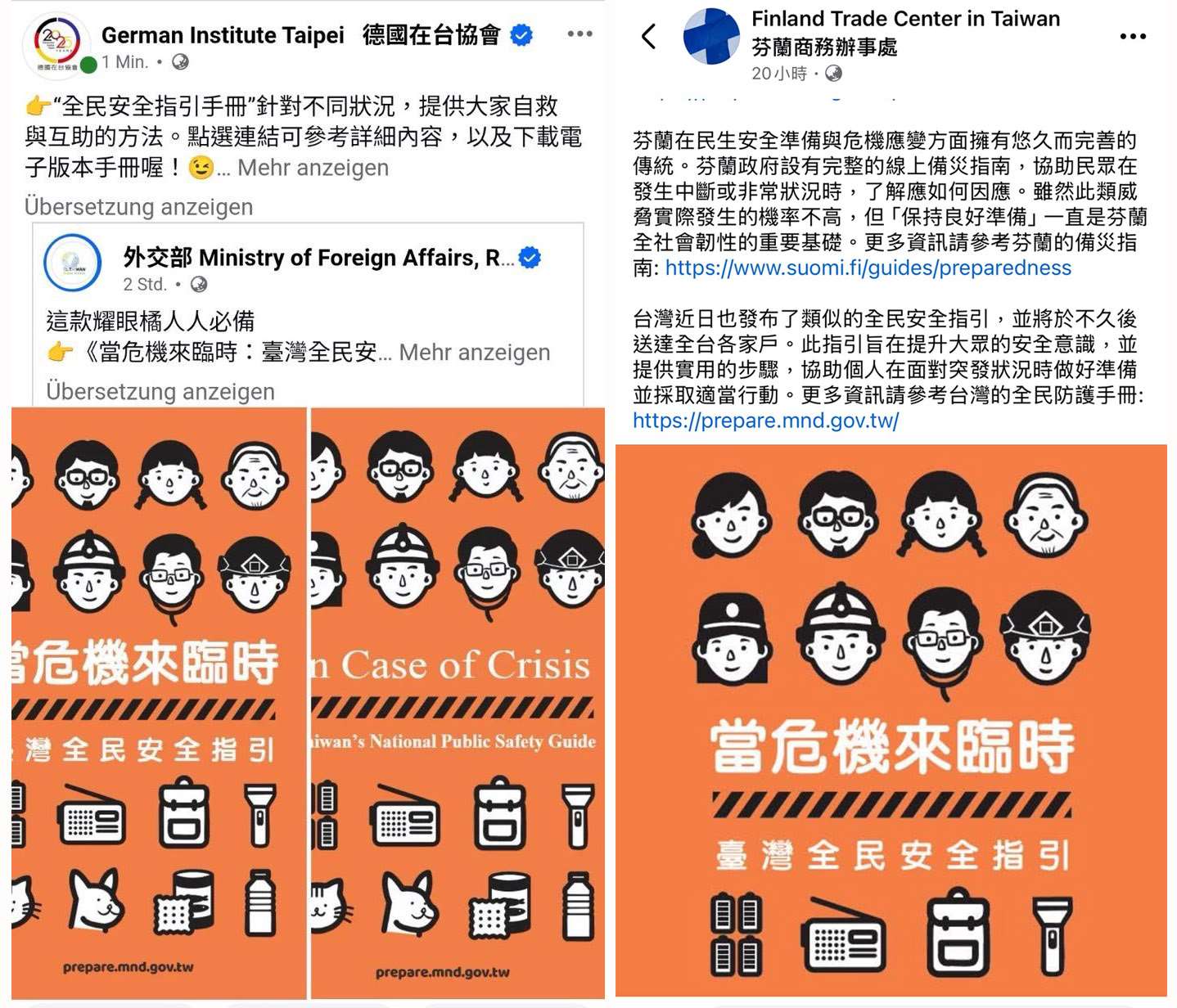 據觀察,多國駐台辦事處均於社群媒體轉發我政府將普發《台灣全民安全指引》的資訊,例如芬蘭商務辦事處發文表示「此指引旨在提升大眾的安全意識,並提供實用的步驟,協助個人在面對突發狀況時做好準備並採取適當行動」,並指出「芬蘭在民生安全準備與危機應變方面擁有悠久而完善的傳統。芬蘭政府設有完整的線上備災指南,協助民眾在發生中斷或非常狀況時了解應如何因應。雖然此類威脅實際發生的機率不高,但『保持良好準備』一直是芬蘭全社會韌性的重要基礎。」此外,德國在台協會也在社群轉發,並表示「全民安全指引手冊針對不同狀況,提供大家自救與互助的方法」。