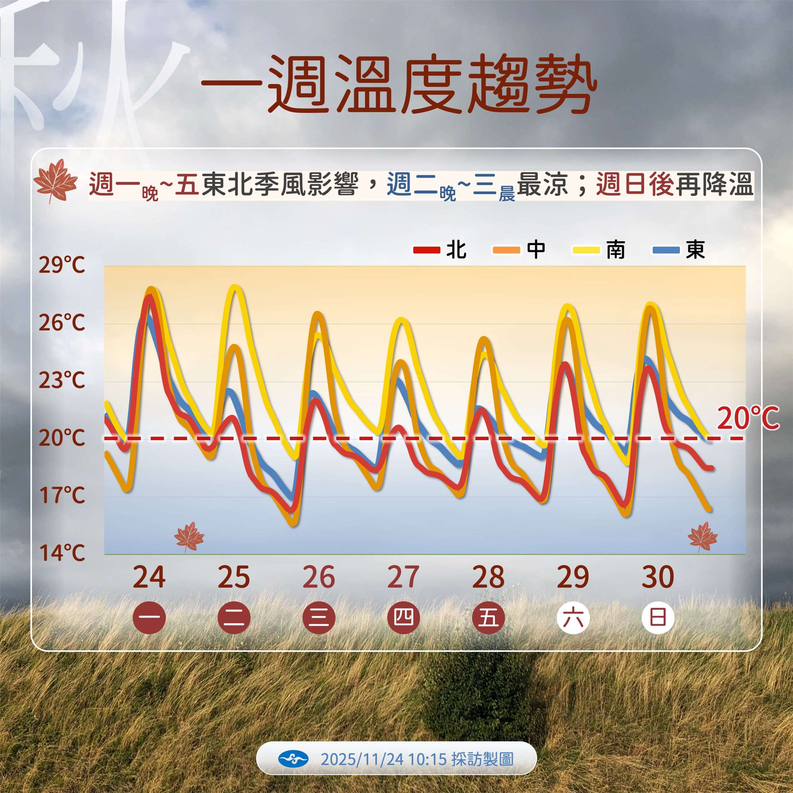 氣溫方面,28日前北部及宜蘭整天都偏涼,其他地區早晚也偏涼。以北台灣為例,24日高溫還有攝氏26-28度,但26日高溫就可能下探20-22度;中南部25日之後的高溫也會從24日的28度略降到25、26度。全台最涼冷的時間則落在26日清晨,中部以北和宜蘭都將下探攝氏14-16度,南部及花東也只有16-19度,需留意日夜溫差比較大。