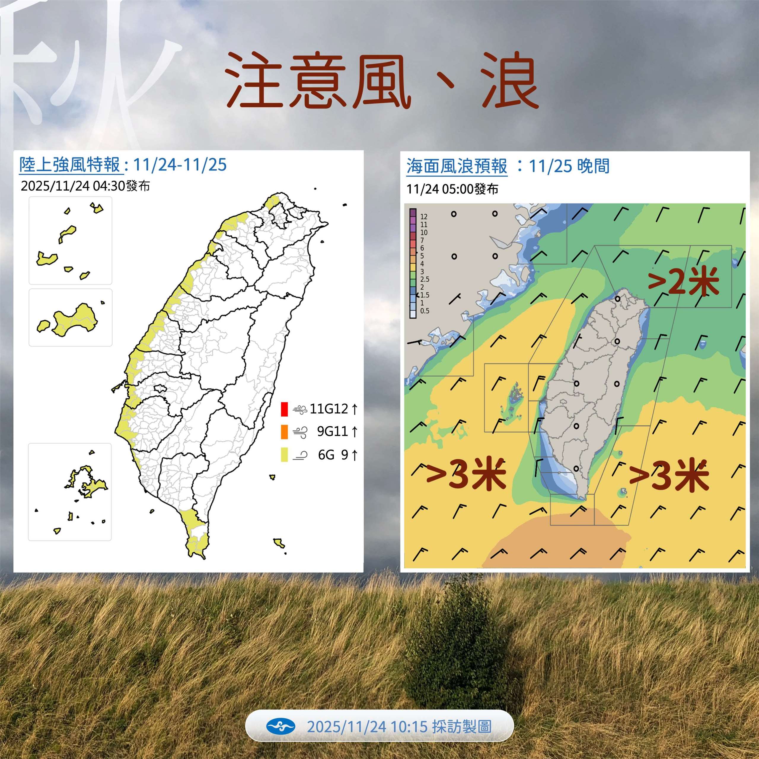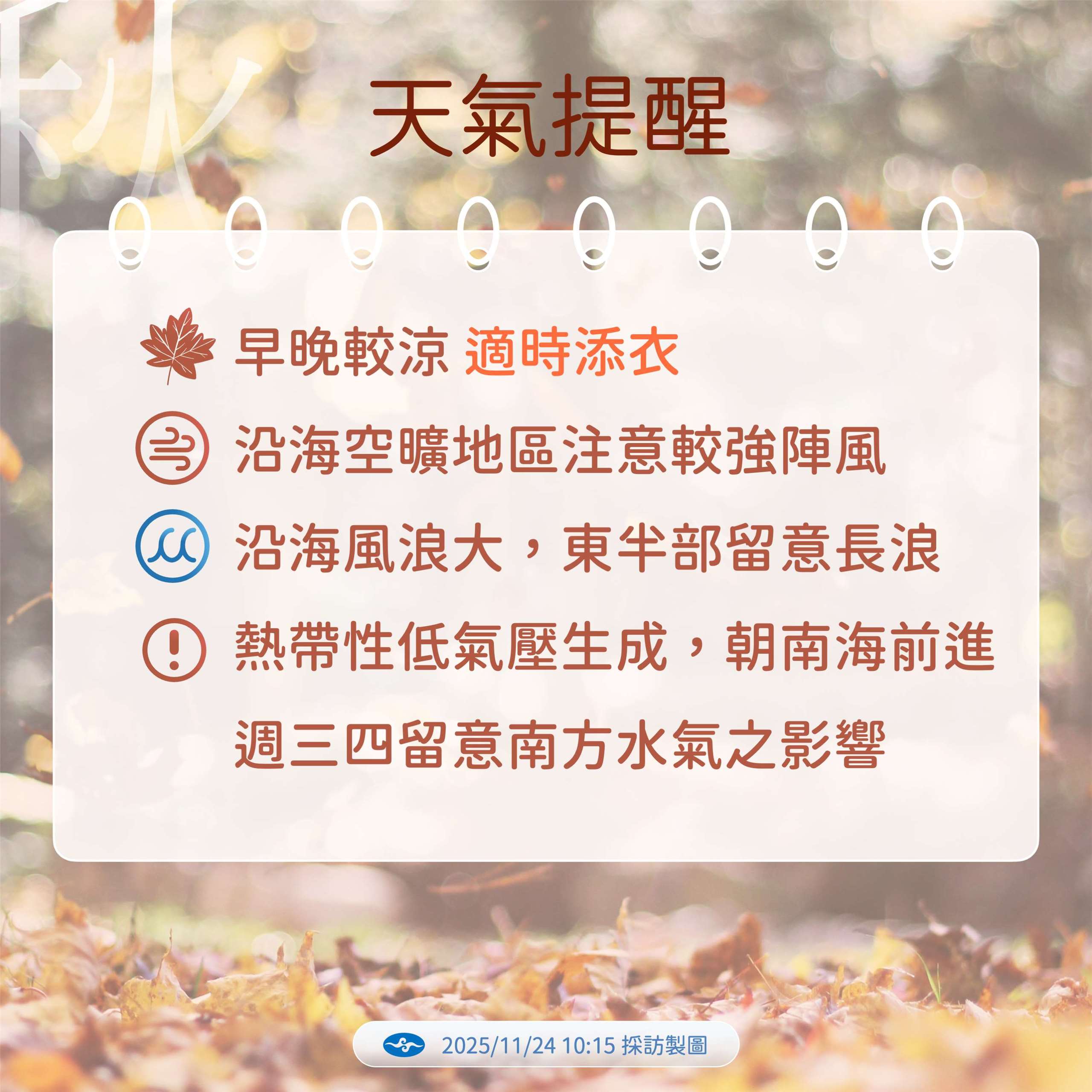 需留意的是,目前正在通過菲律賓、即將進入南海的熱帶性低氣壓TD30可能在之後增強為今年第27號颱風「天琴」,雖然對台灣沒有直接影響,但它的外圍環流可能在26日晚間到27日北飄,所幸還不至於和東北季風產生共伴效應。氣象預報員鄭傑仁說:『(原音)不過在週三晚上、就是26日晚上起到27日,水氣會稍微增多一些。它這個是颱風外圍環流中高層的水氣順著風向飄上來,比較不算共伴,所以除了北部、東半部地區、還有恆春半島持續有些局部短暫雨之外,雨區也會擴大,就是中南部山區有一些零星的短暫雨,那中南部平地的話,可能就是雲量會增加。』
