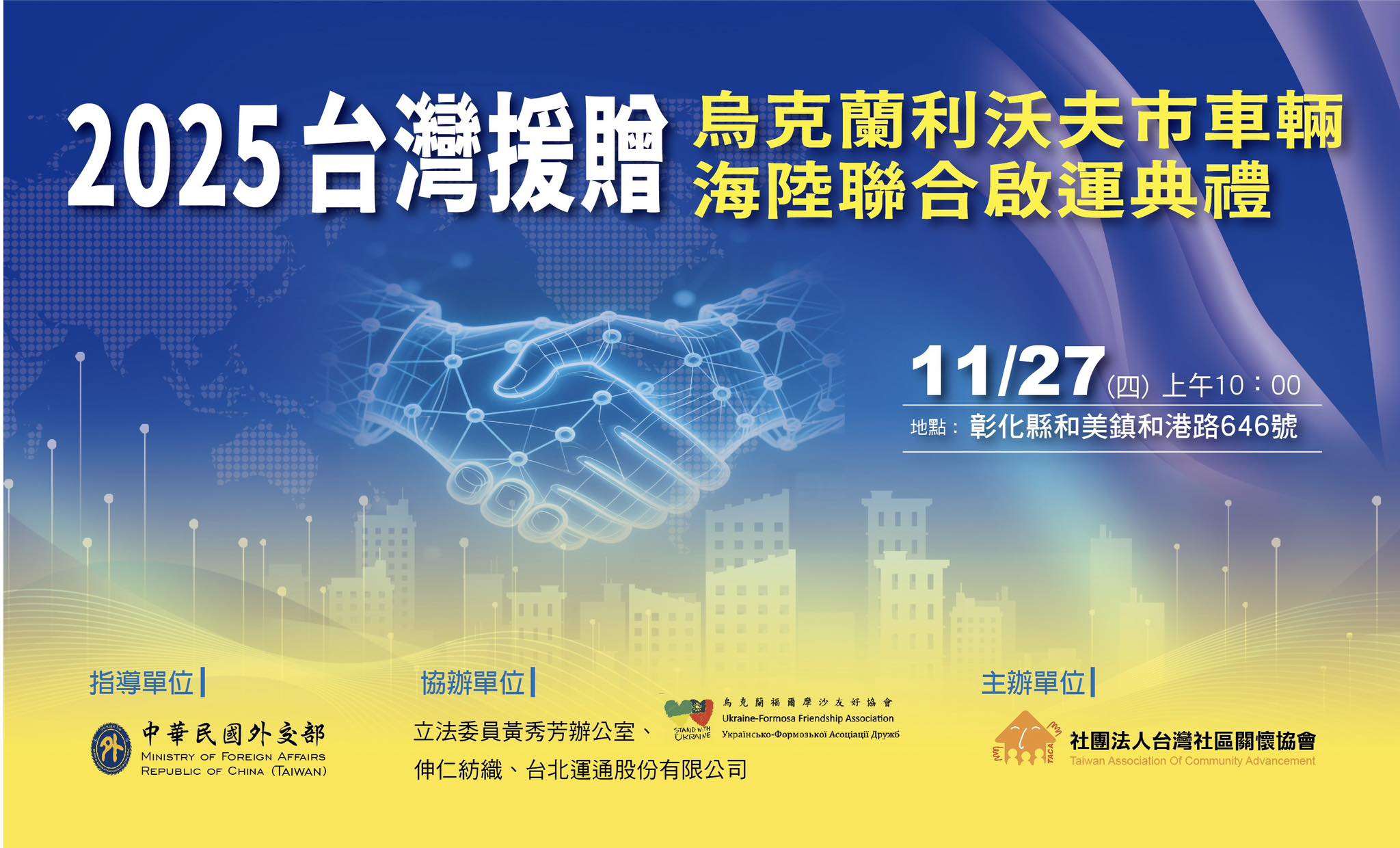 俄烏戰爭持續至今,烏克蘭地方醫療與消防量能持續受損,對於國際援助的需求仍然迫切。台灣民間團體近年持續投入人道救援,社團法人「台灣社區關懷協會」整合戰備災害救助能量,捐贈烏克蘭救災車輛,並將在27日於彰化舉行「2025台灣捐贈烏克蘭利沃夫市車輛海陸聯合啟運典禮」。