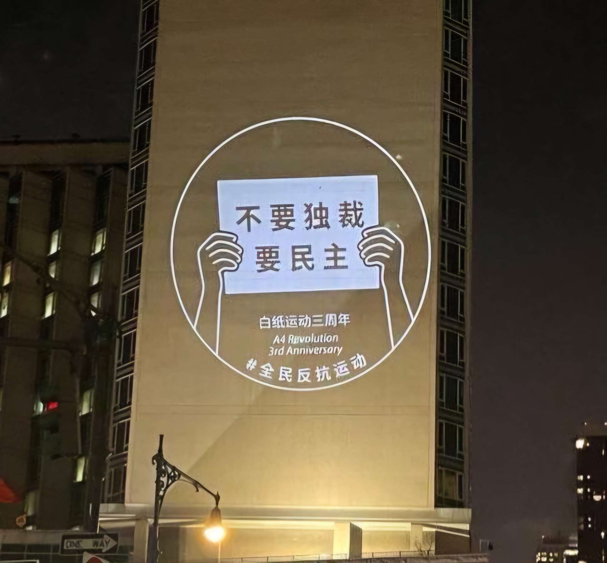 巨幅反共標語投影行動再現!3個月前是出現在中國重慶大學城的大樓外牆,這次則是現身中國駐紐約總領事館的大廈外牆。總部位於美國的人權組織「中國行動」與「全民反抗運動」,為了紀念白紙運動三週年,製作了4組主題標語和圖像,在美東時間26日傍晚5時40分投射在領事館牆上,長達約10分鐘,吸引路人拿起手機拍照或攝影。