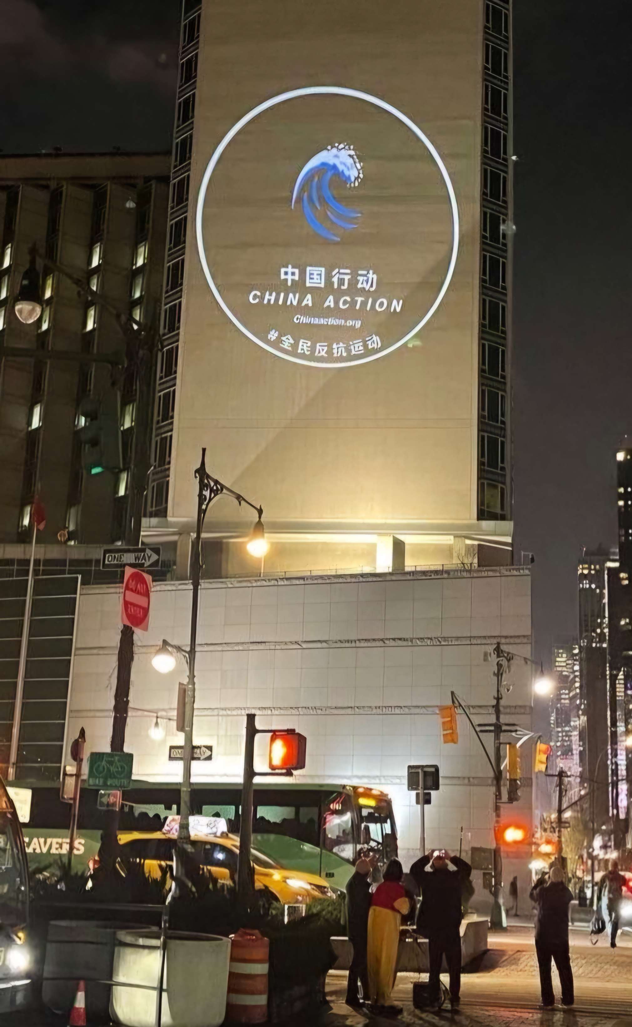 選在美東時間11月26日、中國「白紙運動」三週年之際,人權組織「中國行動」(China Action)與「全民反抗運動」(China resist)聯手展開反共投影行動,在「重慶勇士」戚洪的技術指導下,他們將長寬達18公尺的標語「時間到了,下台吧」,和中國國家主席習近平變「小丑鼻」的圖像,投影在中國駐紐約總領事館的大廈外牆,創下首例。