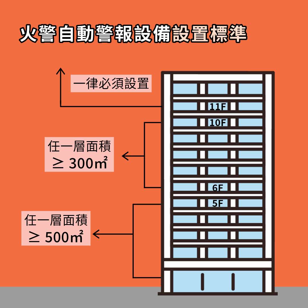 至於火警自動警報設備的設置,根據建築物樓層數的不同有較細緻的規範。5層以下的集合住宅若任何一層的樓地板面積在500平方公尺以上,就應設置火警自動警報設備;6層以上、10層以下的建築物若任何一層的樓地板面積在300平方公尺以上,也應設置火警自動警報設備;而11層以上的建築物,則一律都應設置火警自動警報設備。