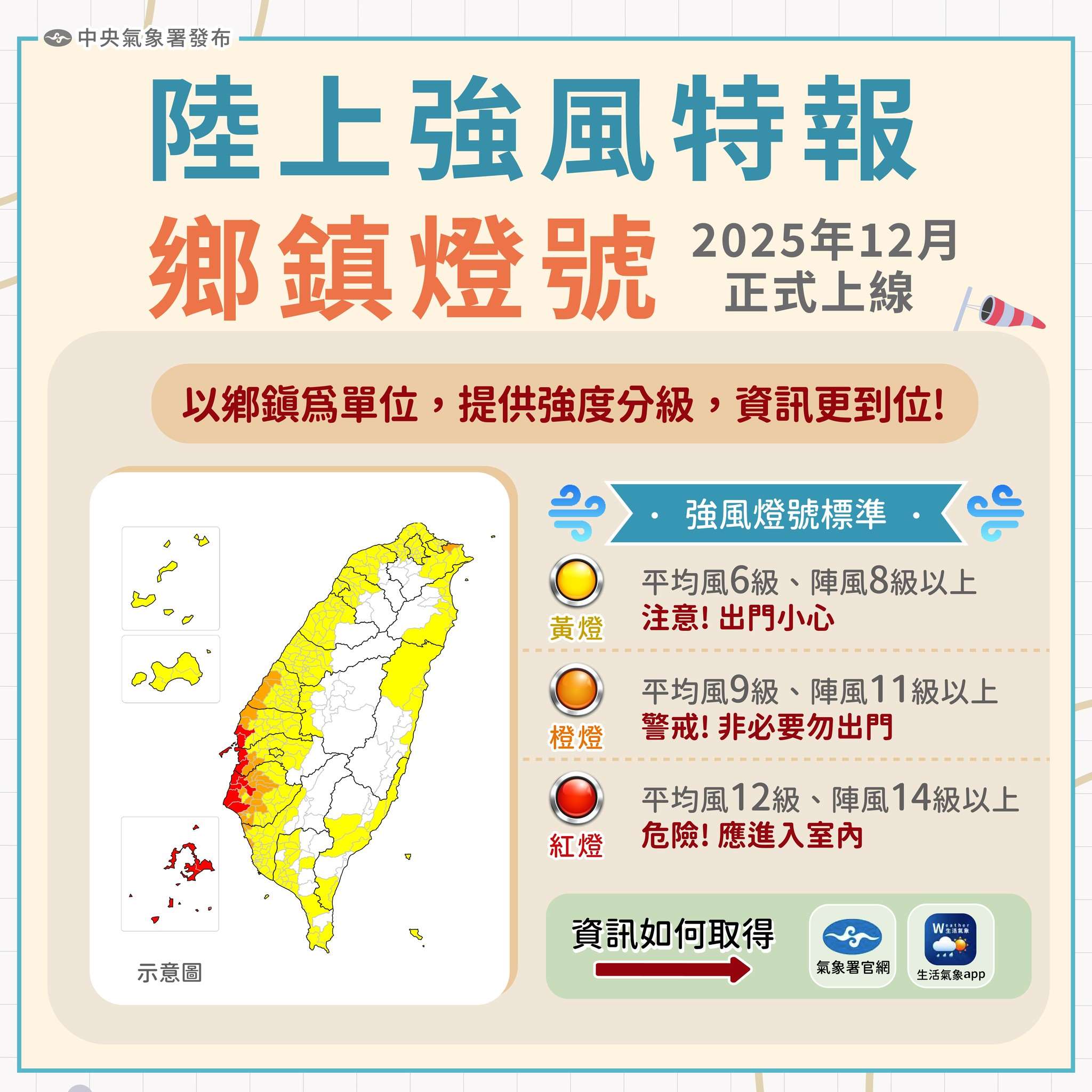 為了提高民眾警覺,氣象預報中心副主任羅雅尹28日宣布「陸上強風特報鄉鎮燈號」將於12月正式上線,以3種燈號警示強度,其中,「黃燈」代表注意、「橙燈」代表警戒、「紅燈」則是危險。她說:『(原音)「黃燈」代表的是平均風會達到6級或者陣風8級以上,一般來說,6級到7級風的時候,大家出門撐雨傘會比較困難一點;那「橙燈」代表的是平均風9級、陣風11級以上,8-9級的時候,有一些東西就會被吹掉下來,10級、11級的風勢更為強勁,就是要盡量避免戶外活動,有一些大型的物品或者路樹等等就有可能被吹斷;那到了「紅燈」就是最危險的,平均風可能達到12級或陣風14級以上,通常達到紅燈,是颱風侵襲或登陸的時候,比較容易達到這種致災型的強風。』