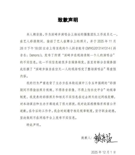 這張聲明自稱,執筆者名叫「賴宗隆」,是濱崎步上海演唱會的攝像(影)團隊工作成員之一,他在「藝人(濱崎步)彩排期間,偷拍了藝人在舞台上的照片」,並在11月28日下午6時左右上傳到自己的抖音帳號。