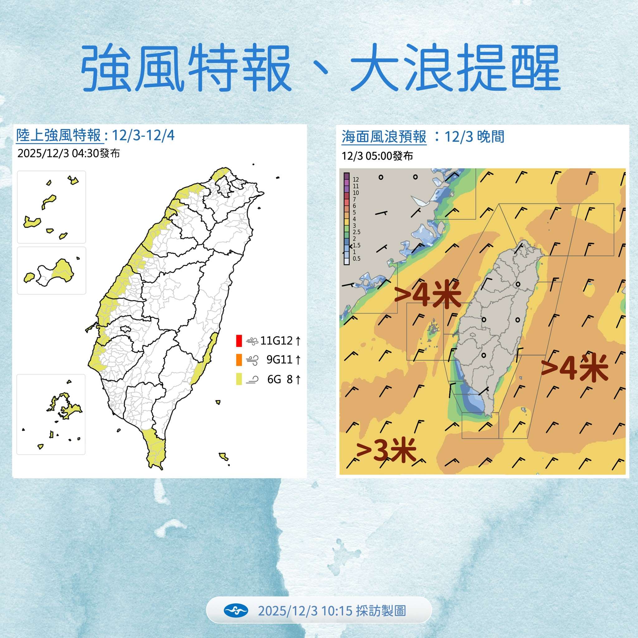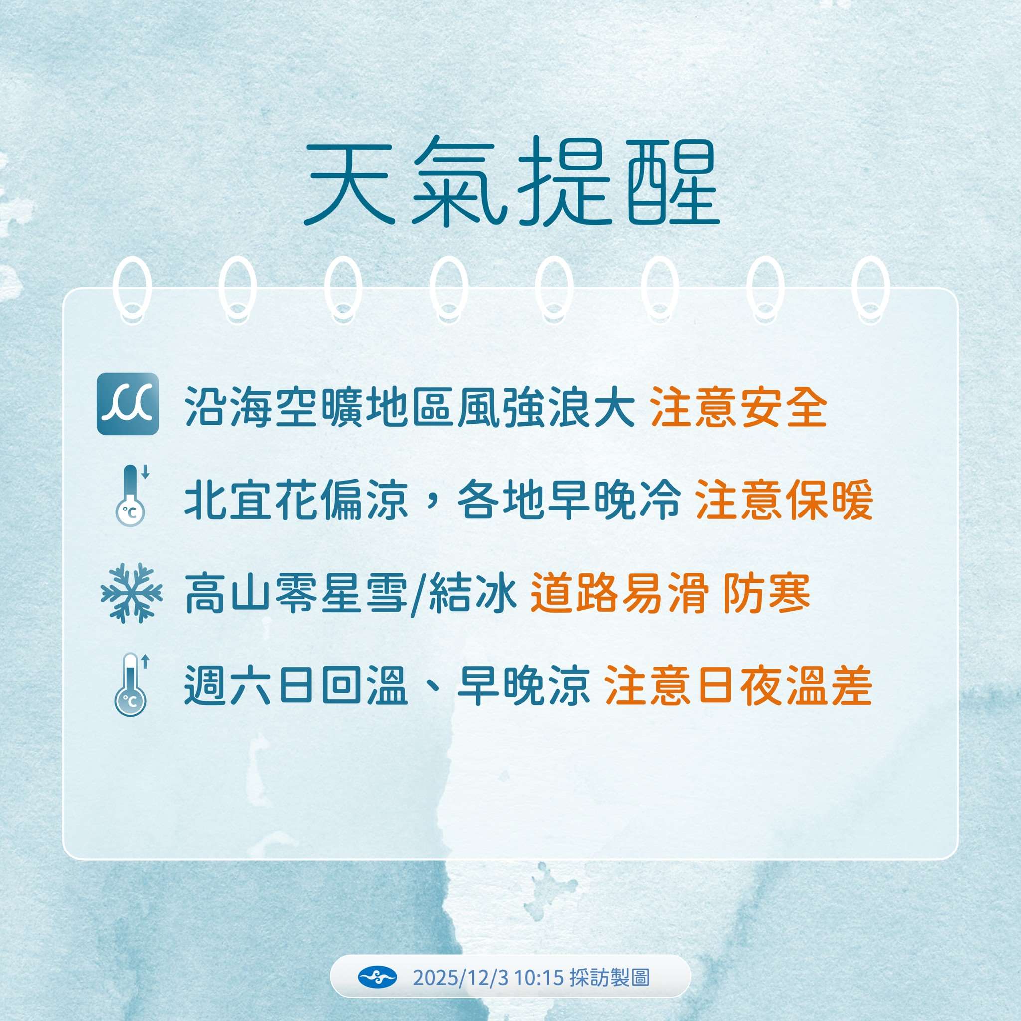 需留意的是,由於3日白天伴隨華南中層水氣通過台灣,因此,除了中部以北3,500公尺以上的高山可望迎來零星的白雪,入夜後到4日清晨的平地最低溫也將下探攝氏14度甚至12度。氣象預報員蔡伊其說:『(原音)今天在中部以北3,500公尺以上的山區是有零星降雪的機會,可能是今天白天的機率會比較大一點,因為在晚上之後,這個華南的中層水氣就逐漸地減少。不過,以平地的最低溫來講,大概是今晚到明天清晨的低溫會是最低的,預測在西半部及宜蘭的低溫大概會降到(攝氏)14至16度,花東大概是18度;局部地區像沿海空曠地區或近山區的平地,可能會再低1到2度。』