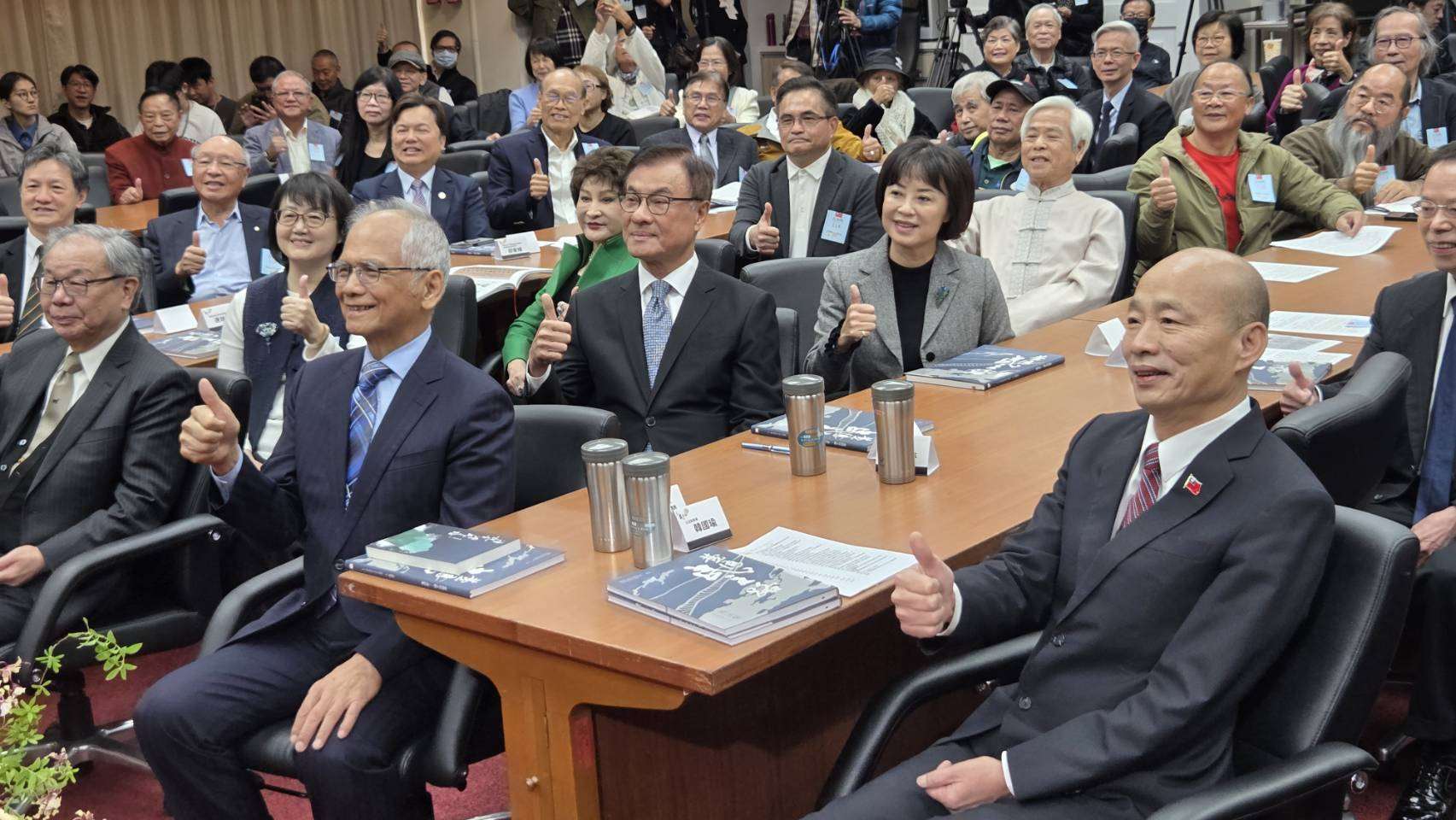 仰山文教基金會創辦人、立法院前院長游錫堃16日舉辦「台灣民主路書法集」新書發表會,現任立法院長韓國瑜、前院長王金平、蘇嘉全等人同台祝賀。(劉玉秋攝)