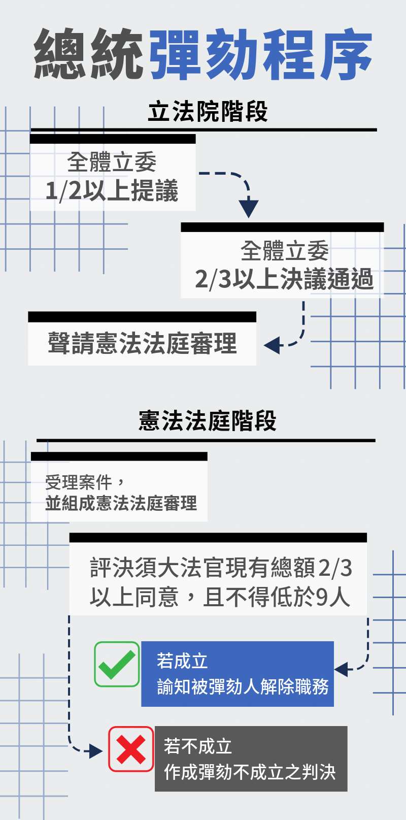 依據中華民國憲法增修條文及立法院職權行使法,立法院對於總統、副總統之彈劾案,須經全體立法委員二分之一以上之提議,交付全院委員會審查,經全體立法委員三分之二以上之決議,聲請司法院大法官審理。