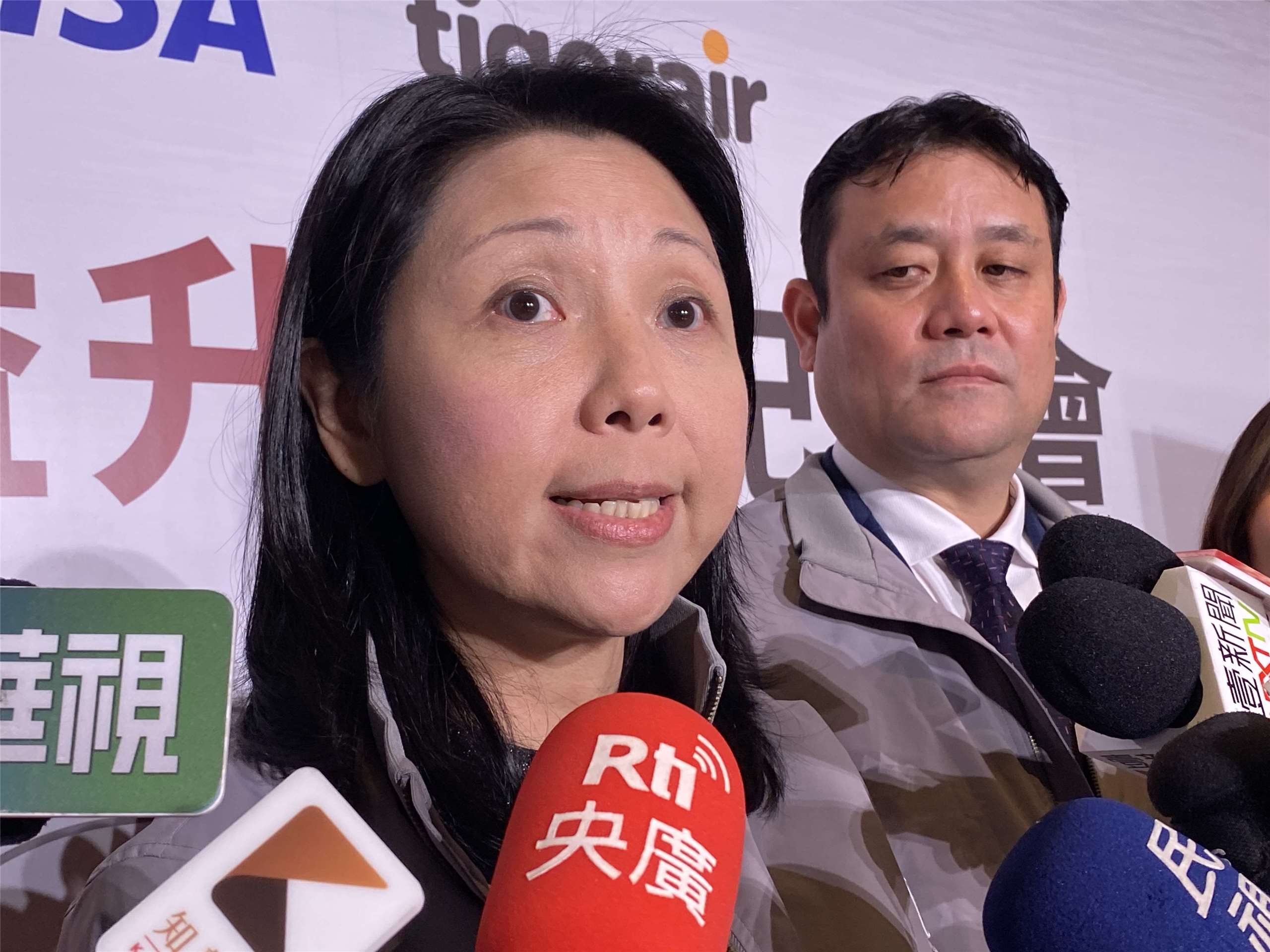 台灣虎航董事長黃世惠(前)7日與台灣樂天信用卡總經理石井英治(後)在「樂虎卡」升級2.0的啟動典禮上受訪。(吳琍君攝)
