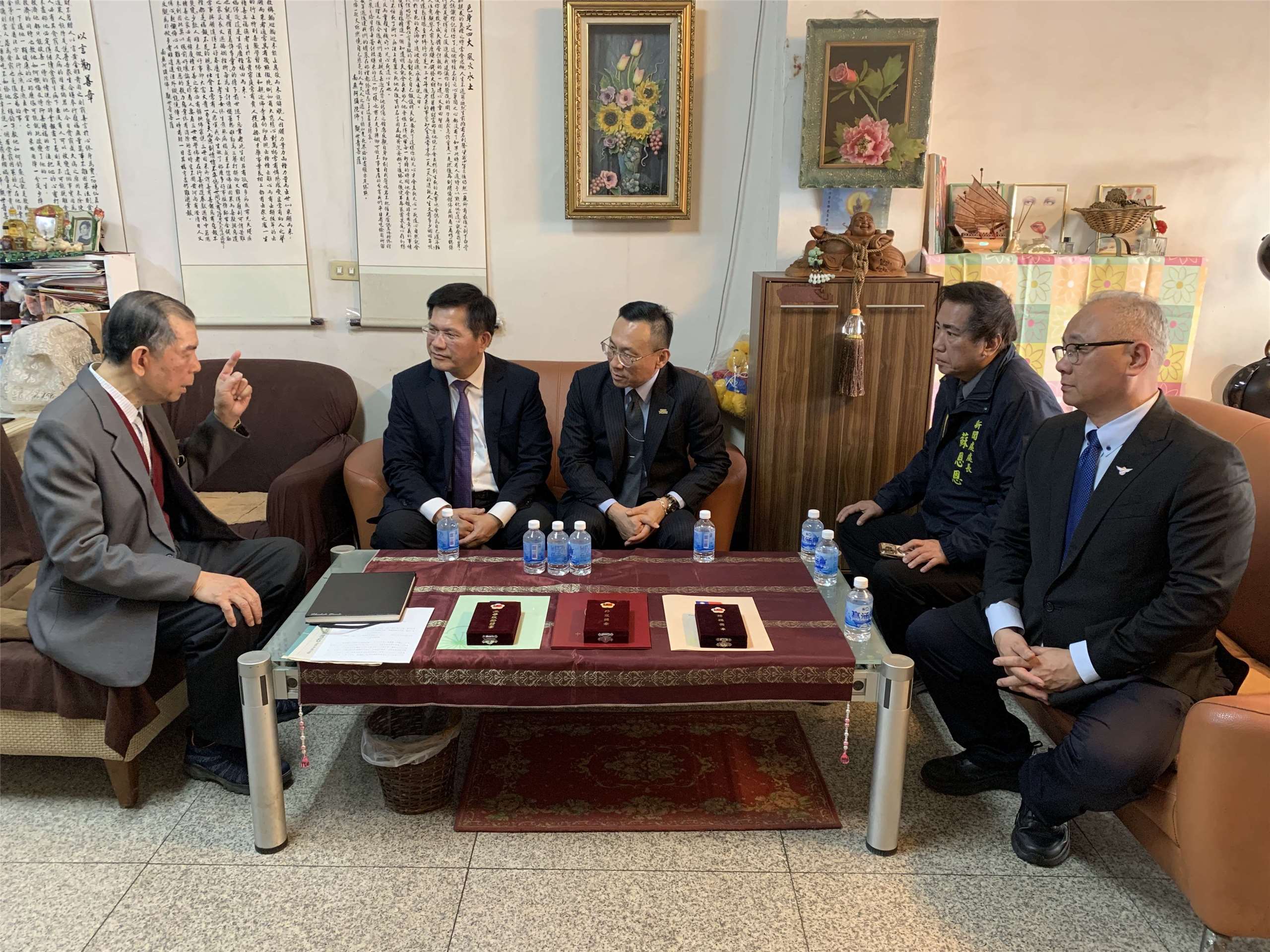 外交部林佳龍部長(左二)、外交部亞太司長林昭宏(左三)赴台南向謝柏輝公使尊翁謝吉興(左一)致意,台南市新聞處蘇恩恩處長(右二)與謝公使摯友開南大學陳文甲副校長也陪同部長赴謝宅致意。圖:謝公使家屬提供