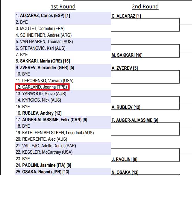 澳洲網球公開賽14日舉辦「一分大滿貫」比賽,台灣另一位參賽女將葛藍喬安娜(Joanna Garland )國籍標註是「TPE」(中華台北)。(澳網官網)