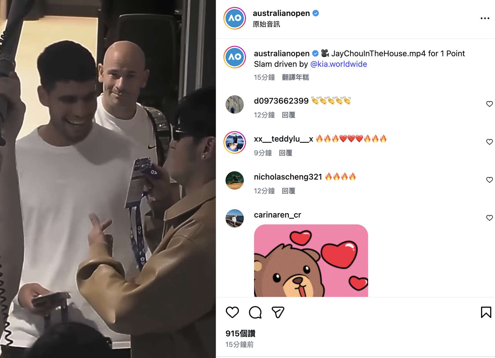 周杰倫進軍澳網的這兩天也在網路掀起高度討論。澳網官方IG更特別在賽前分享他與「小蠻牛」阿卡拉茲(Carlos Alcaraz)相見歡的畫面。主播介紹周杰倫時,則稱他是來自台灣的歌手、詞曲創作人。