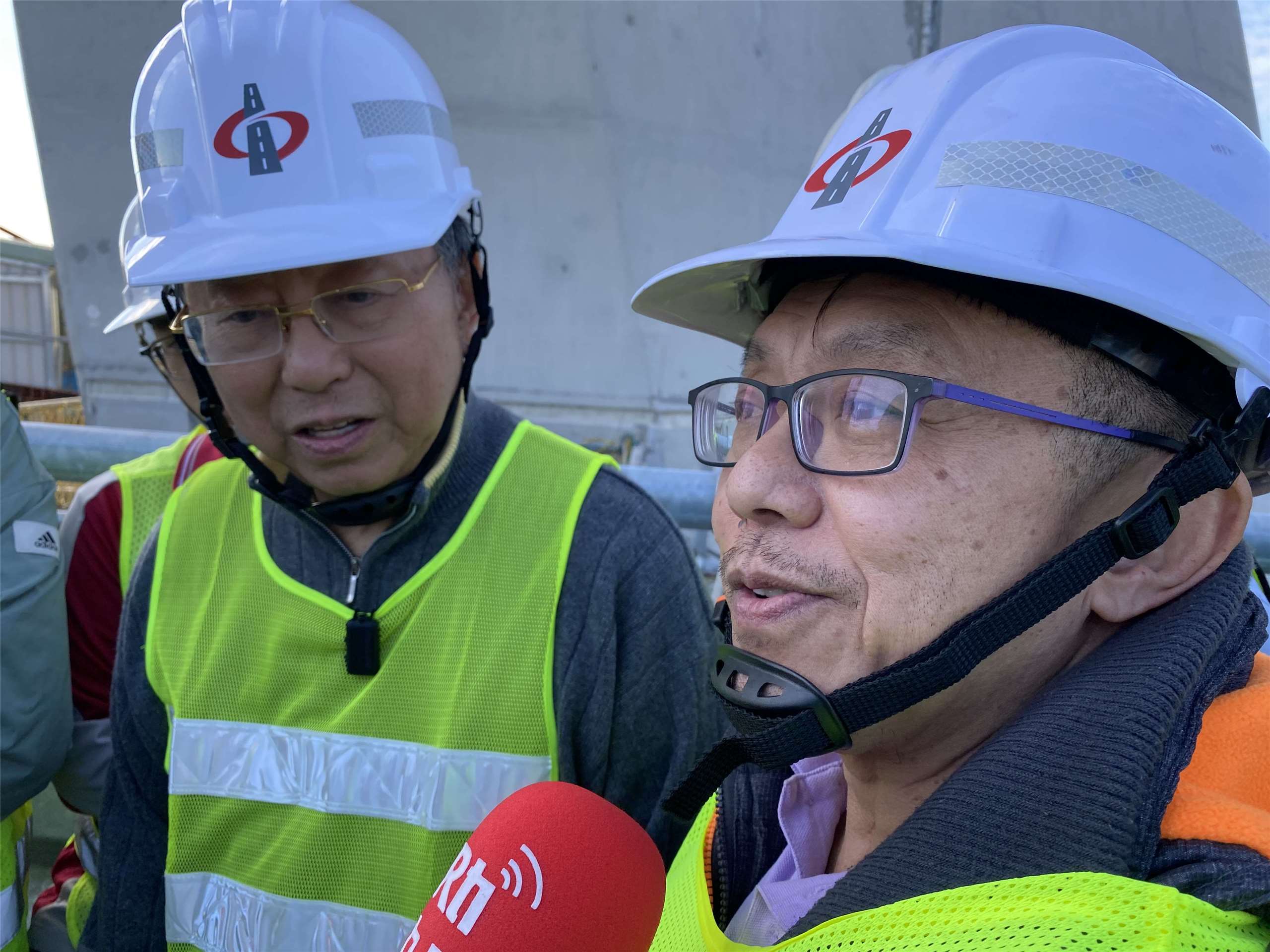 此外,陳世凱也指著一根根模仿雲門舞集的舞者翩翩起舞的景觀燈柱,說明全橋總計有126支景觀燈柱,預計1月底會全數安裝完成,而這些燈柱最大的特色就是外柔內剛。陳世凱說:『(原音)這個燈柱其實相當地特別,有10公尺到27公尺都有,因為它長度非常地長,而且我們在橋面上有時候風也會非常地大,所以它的強固性就相當地重要;而且這個燈柱不是直的,幾乎都是斜的,從斜20度到斜70度都有,所以這樣子的角度,你又必須要做到耐風,而且又必須這麼高的狀況底下,它的燈柱鋼板厚度就特別高,我們一般在市區看到的燈柱,它的鋼板厚度大概是0.3-0.6公分,我們這裡的燈柱厚度是將近10倍,也就是3.5公分的厚度。』