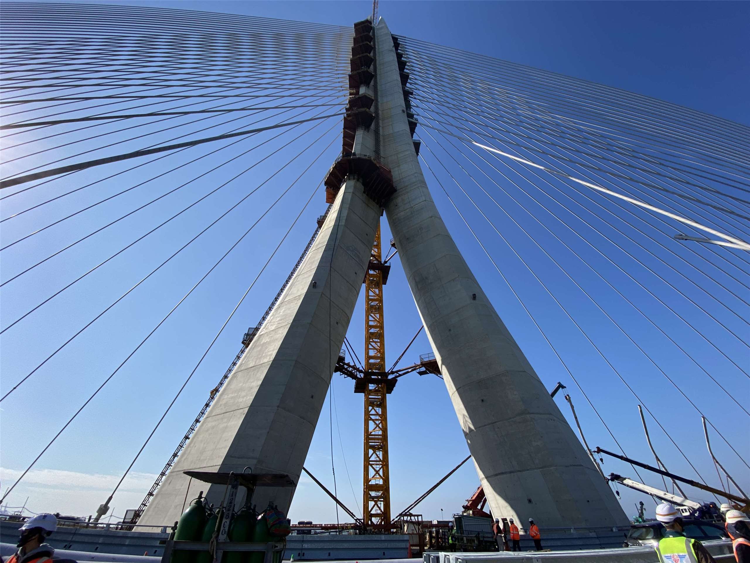 鄭閔中指出,事實上,要將這94根、最長400米的HDPE套環拉到100米以上的高空,再固定於橋塔柱上,過程既辛苦又困難。