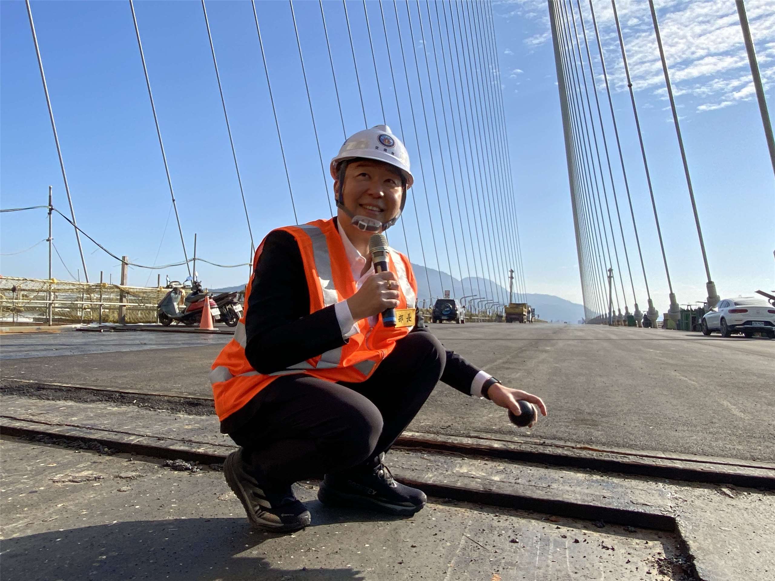 陳世凱拿著施工單位以GUSS瀝青做成的圓球指出,未來淡江大橋的鋪面就由最底層的鋼板,以及中間厚4公分的GUSS瀝青,還有最上層、同樣厚4公分的改質瀝青組成,可望提升橋面的耐久性與行車的舒適度。