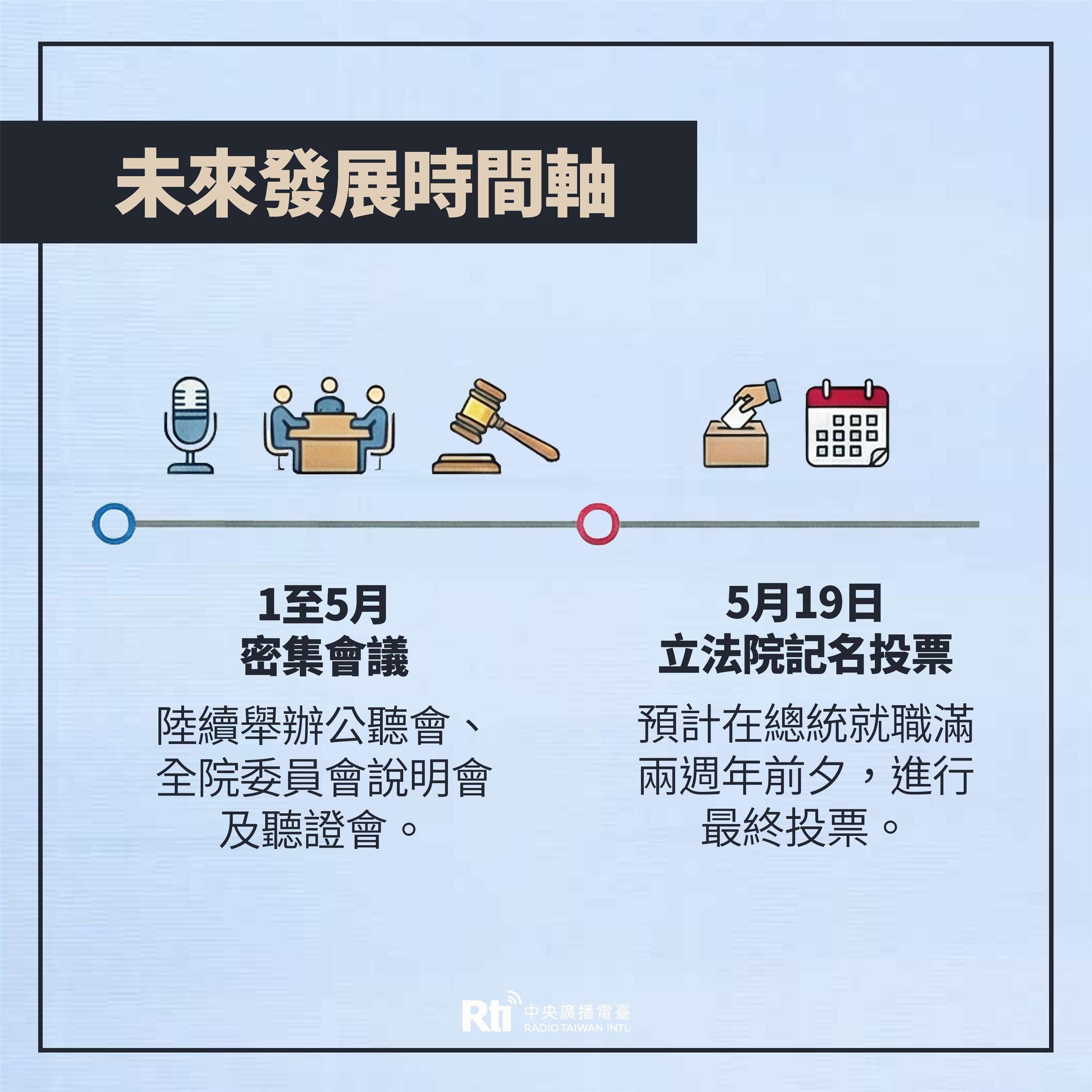 接著,預計在4月27日將舉辦「聽證會」,屆時會邀請有關政府官員或社會相關人士出席發表意見、接受立委詢答;5月13、14日則將舉辦第二場全院委員會的「說明會」,到時候立法院也會再次邀請總統列席說明。