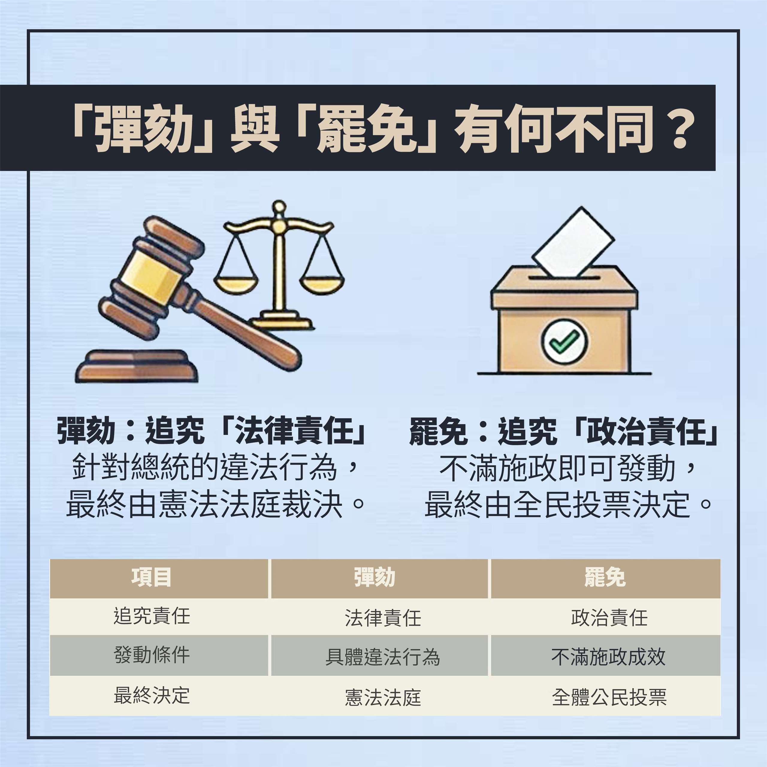 「罷免」追究的則是總統或副總統的「政治責任」,比如對施政成效或政策推動不滿時即可提議,無須有具體違法事實,且罷免最終需經全民投票,是民主國家人民收回政治授權的途徑。