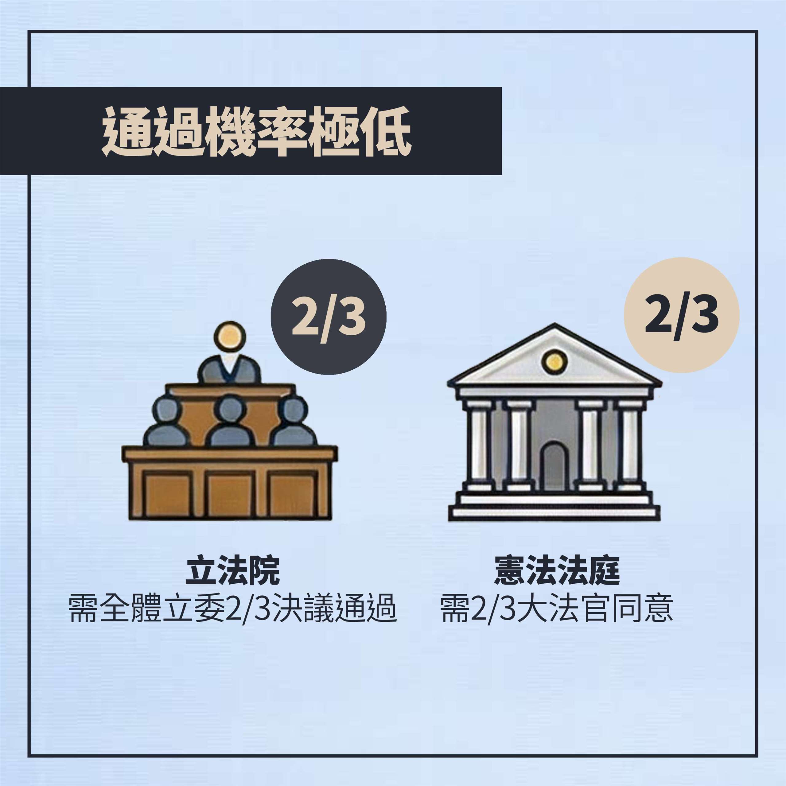 根據目前立法院的席次分布,在野的藍、白兩黨人數合計並未超過三分之二,立法院成功送出彈劾案的機率非常渺小。民進黨立委吳思瑤便曾指出,在野黨明知彈劾案不會通過還硬要推動,本質上是政治鬥爭也是空包彈,目的只是為了羞辱賴總統。