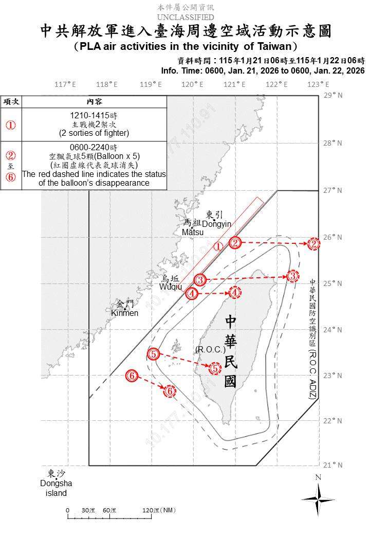 國防部表示,自昨天(21日)上午6時至今天(22日)上午6時,偵獲2架次共機及5艘共艦,總計中共7機艦持續在台海周邊活動,並偵獲5顆空飄氣球,國軍嚴密監控與應處。